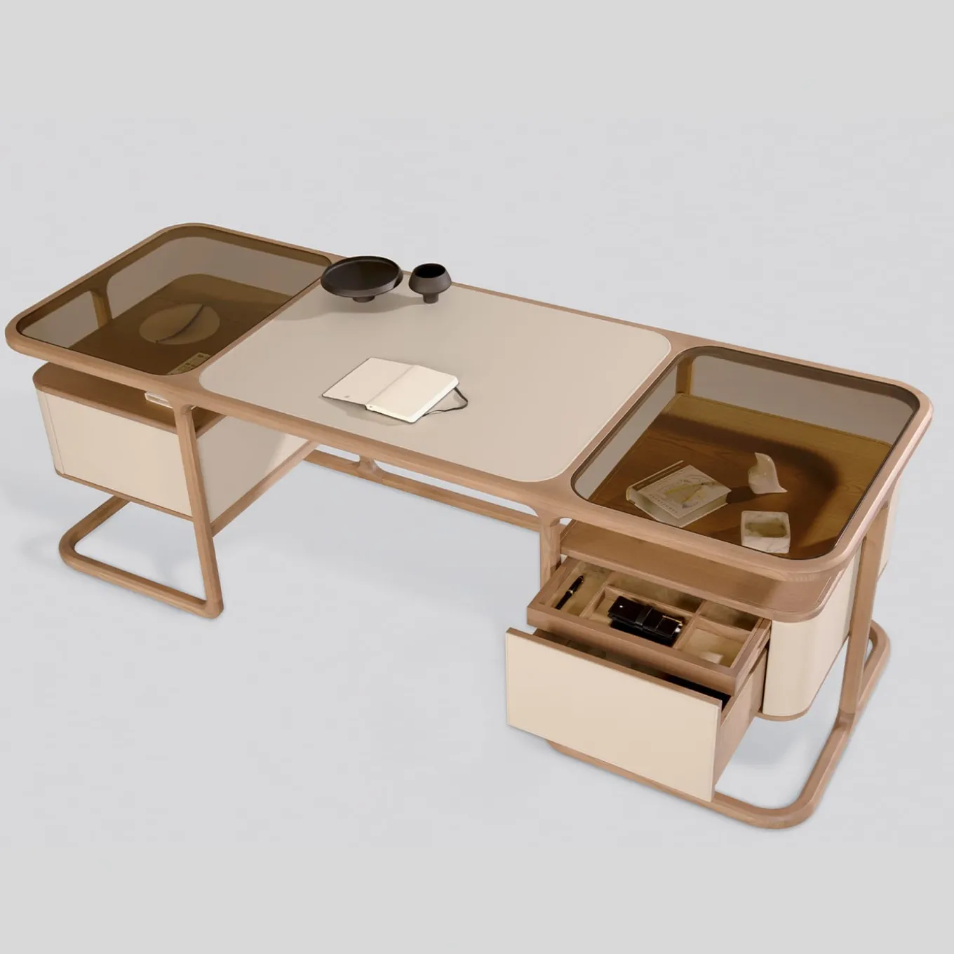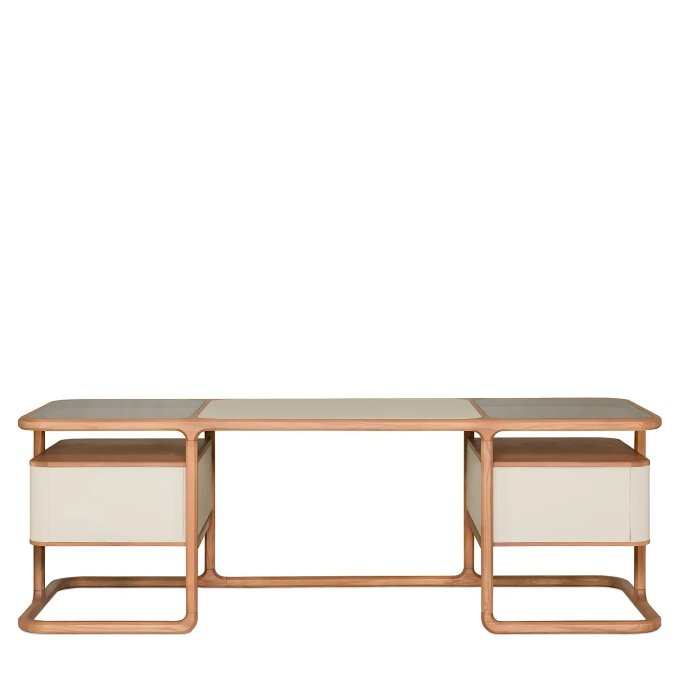 The minimal design and extreme versatility of this refined 2-sided desk by Libero Rutilo is ideal for small living spaces that require two workstations. Crafted in turned ash wood for a sinuous silhouette and featuring two side glass desktops and a central hide one. Each side is equipped with hide side-lined drawers and two secret storage compartments. Measures 226x80x75cm.