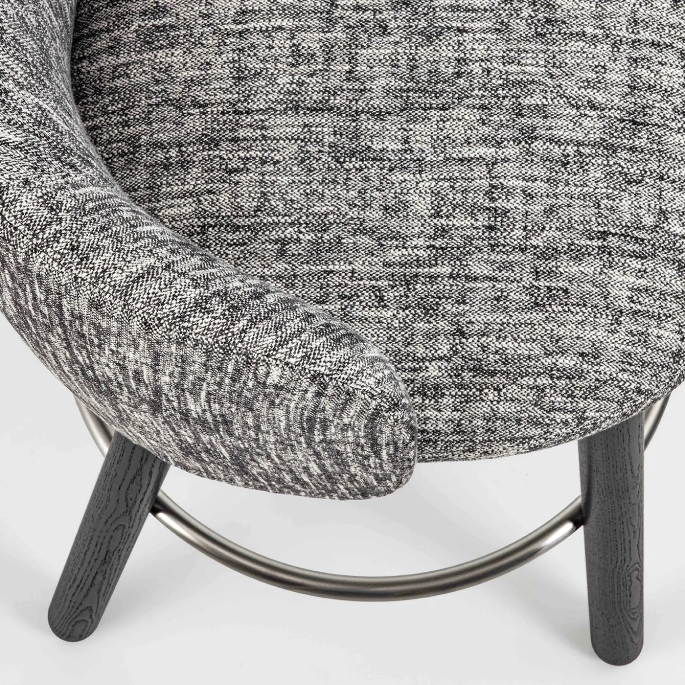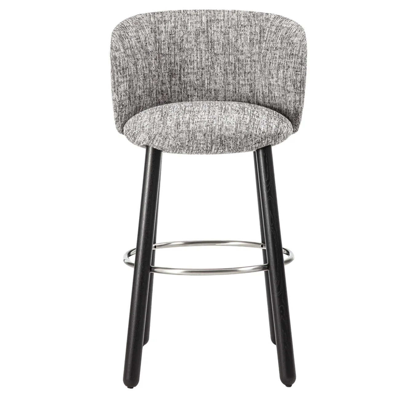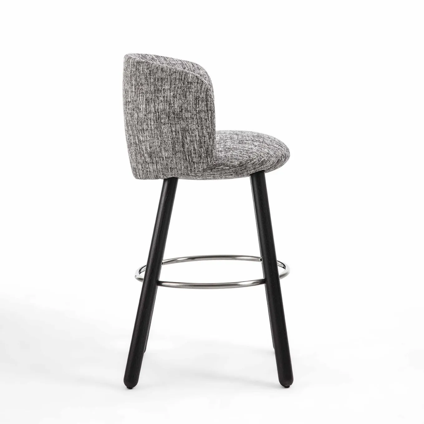 Unique seat with steel frame shell, expanded polyurethane padding covered in different material. This stool combines modern design and high-quality materials, making it a distinctive element for any space. Four leg turned wooden base available in ash or Canaletto walnut.