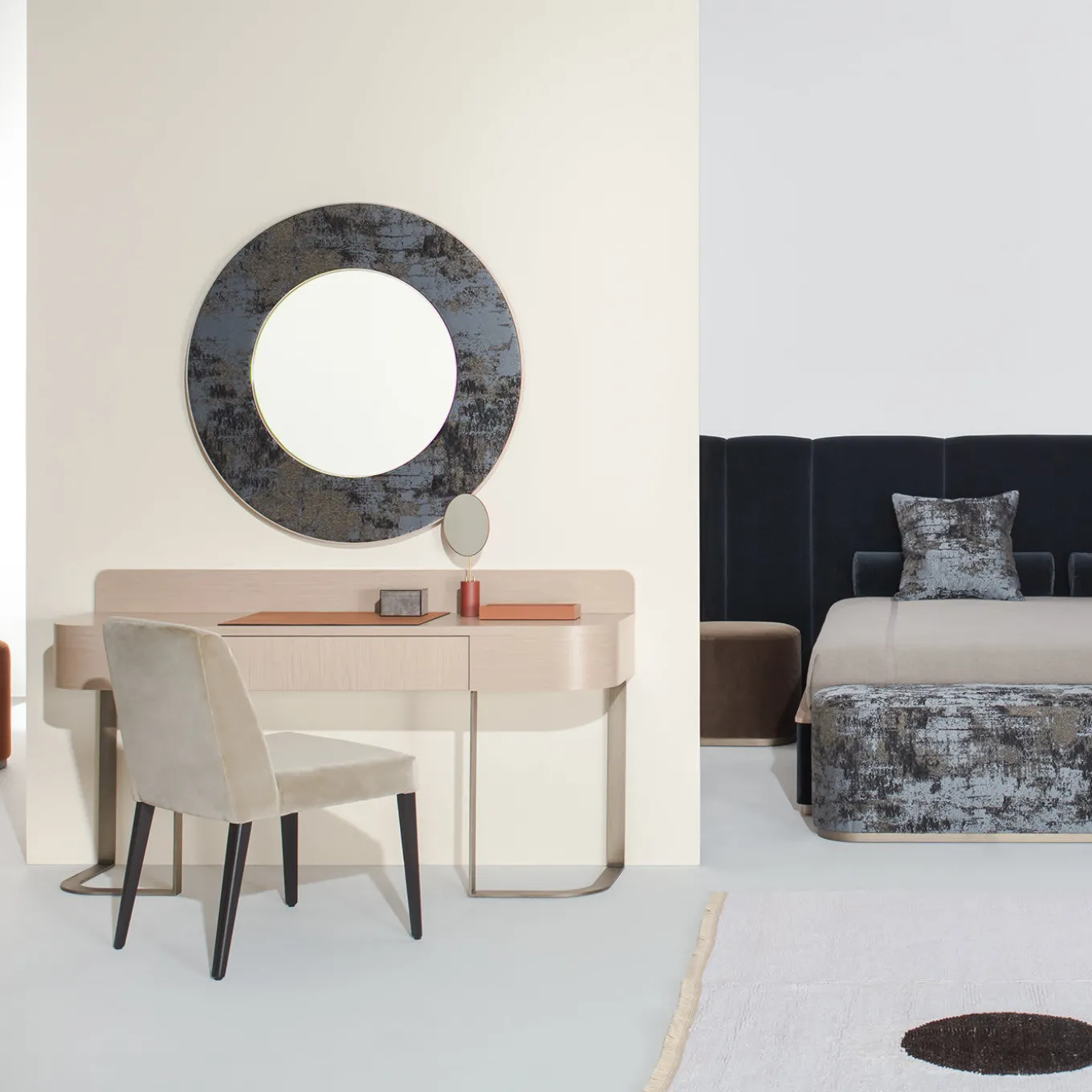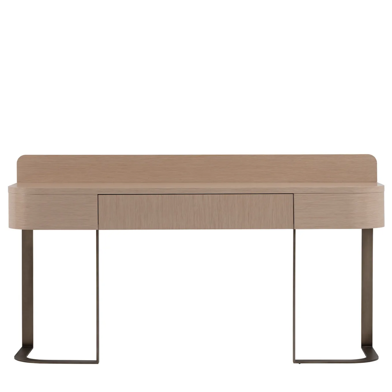 Effortlessly decorating a living room or entryway, this refined and functional console is built on an eye-catching open base with two sled-style iron legs finished in brushed brass forming a V-shaped foot. The natural oak-veneered wood top showcases a single, central soft-closing drawer with concealed runner system. This desk/console is fixed to the wall with steel brackets (included) and has nylon glides to protect hard wood, tile floors, and carpeting. Contract and commercial certifications available upon request.