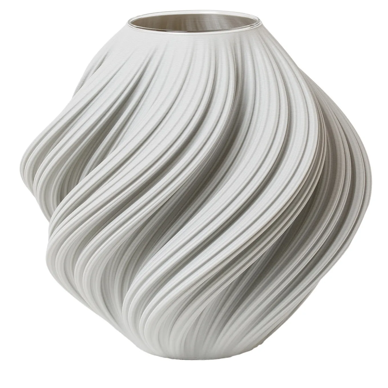 This sculptural vase features flowing pleated lines that evoke a sense of delicate movement inspired by the sway of fabric. Crafted from biodegradable PLA, a non-toxic thermoplastic derived from renewable resources such as corn starch, the vase combines sustainability with artistic design. It includes a glass inner container, as the exterior is not water-resistant. Available in a customizable gray shade, this piece suits contemporary home decor with an emphasis on nuanced texture and eco-conscious materials.