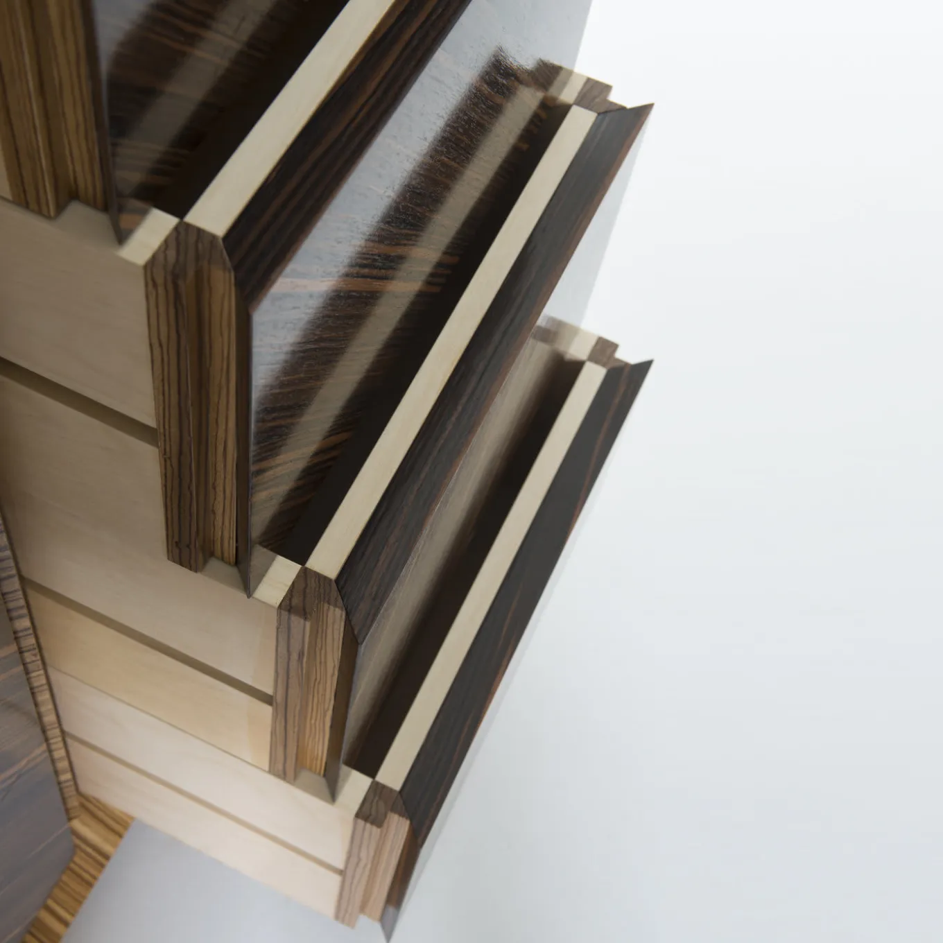 This unique chest of drawers will make a statement when placed in a bedroom or walk-in closet. The exterior structure is crafted in solid wood with a striking zebra-striped pattern. The front and back of the piece are in ebony macassar wood with a 45 degree cross cut pattern, with eight frontal drawers and an additional lateral and central opening. The base is also in zebra-striped wood, and the sub base in ebony macassar. The interior of the drawers are in maple wood. Designed by Antonio Berdondini, year 1944.