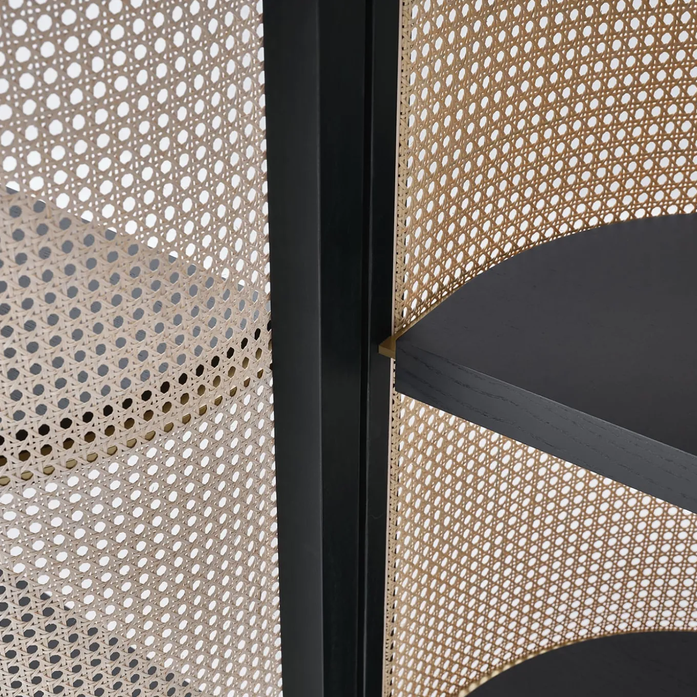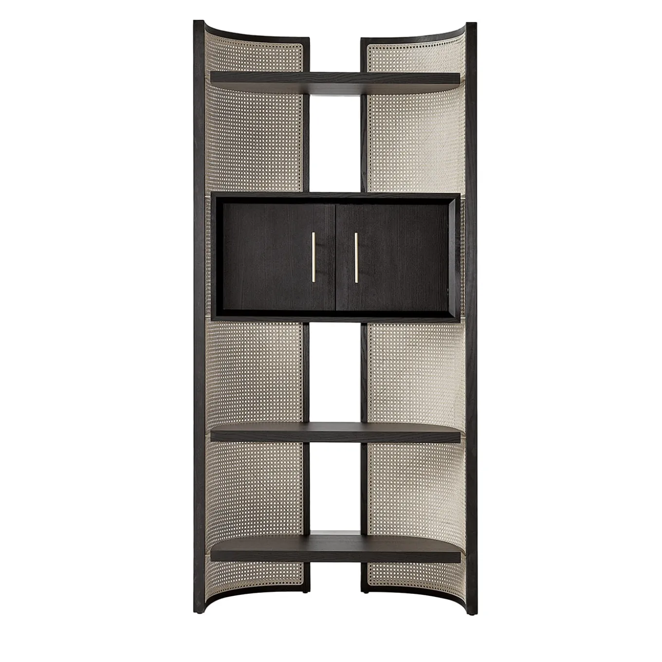 Precious finishes and enveloping curves characterize this bookcase, a subtly sculptural design echoing refined oriental atmospheres. Set in a couple of curved moka-stained ash frames, Vienna straw adds a traditional accent to its silhouette, complete with shaped shelves and a closed storage unit all crafted of moka-stained ash-veneered MDF. Matte golden metal details perfect the design.