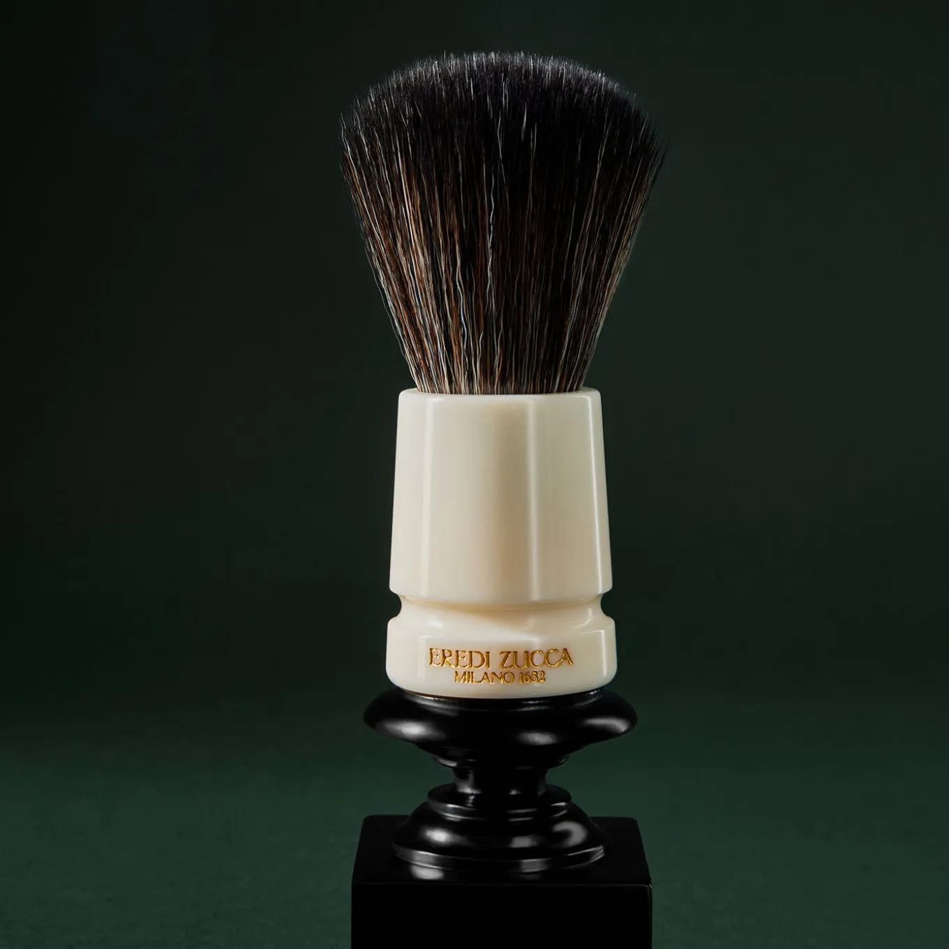 This accessory has been crafted with exceptional care for both materials and details, using the most prestigious of techniques that define the art of Italian craftsmanship. Hand-finished with a delicate ivory varnish, its resin handle is embellished with a brass Eredi Zucca medallion on the base. A harmonious silhouette and comfortable grip make this professional brush a high-precision, robust and effortlessly functional tool.