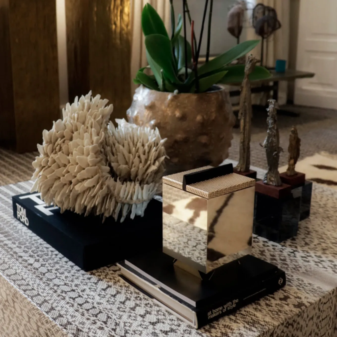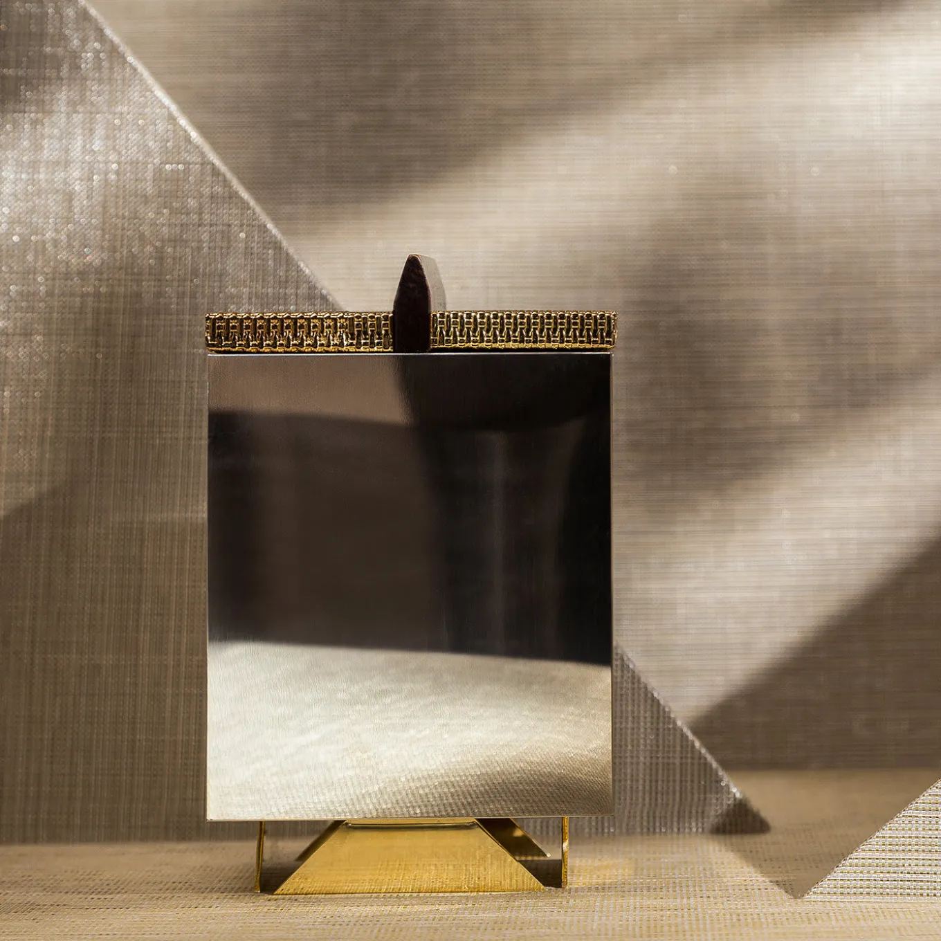 Luxe and splendidly reflective, this fine box marked by a rigorous geometry will enrich any desk or vanity with its bold look. The solid Canaletto structure is wrapped in nickel silver plates, their characteristic sheen harmonizing with the glistening look of the brass lid, which showcases a pleasant mesh-like texture standing in contrast with the linear dark wood knob. The base is comprised of trapezoidal elements in brass-finished metal that are an homage to Mayan pyramids.