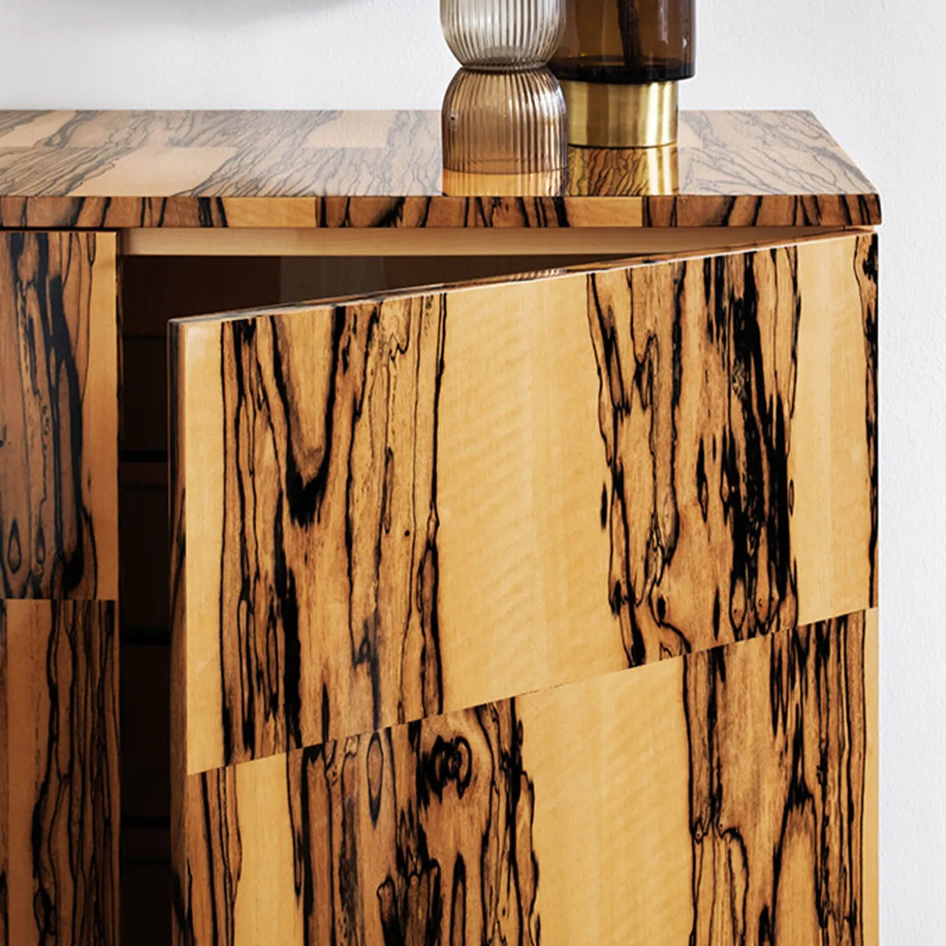 Reinterpreting the concept of traditional storage in an eye-catching design, this exclusive cabinet will be the focal point in a modern living room and dining room. The luxurious checkerboard pattern is crafted by masterfully assembling Albin wood-veneered pieces, whose stunning natural wood grains are enhanced by a glossy finish. The two doors have a push-open system to preserve the harmony of the design and reveal an interior storage of glossy natural maple with two shelves. A piece of great visual impact, this cabinet is best displayed with minimal accents.