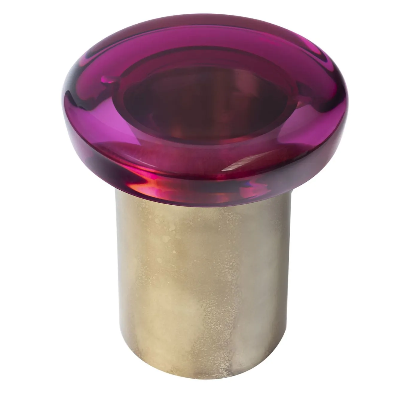 Jade stool features ethereal transparency and a reflective surface that plays naturally with light. The brightly colored seat rests on a cylindrical brass base, whose distinctive veining is achieved through a skillful etching treatment. The juxtaposition of the ever-unique shades — meticulously blended in our atelier — and the golden accents makes it a precious piece. All of the epoxy resin tops belonging to this series are designed to be interchangeable. Available in different colors.