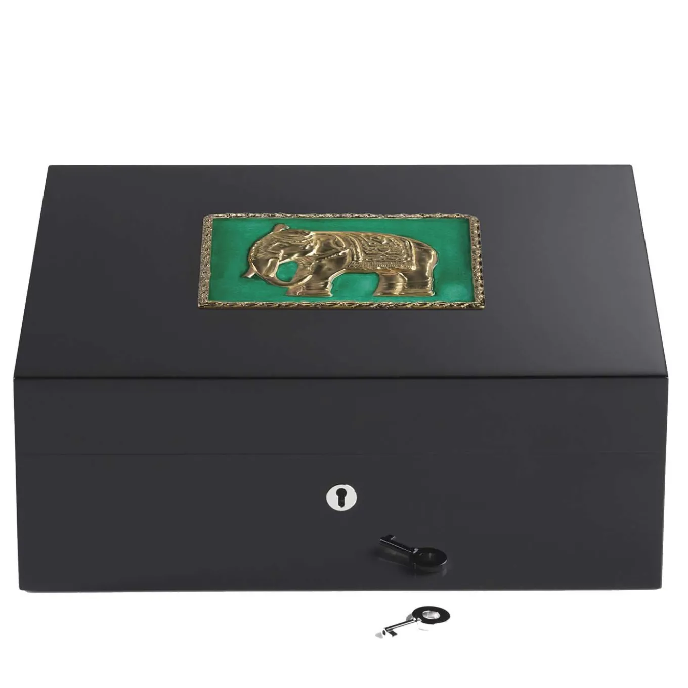 This refined humidor is an original object crafted of precious wood. Showcasing a sleek design, adorned with a symbol of the Indian culture: the elephant. The square decoration features golden edges that match the central reproduction of the elephant. The painted black structure can contain up to 75 cigars.