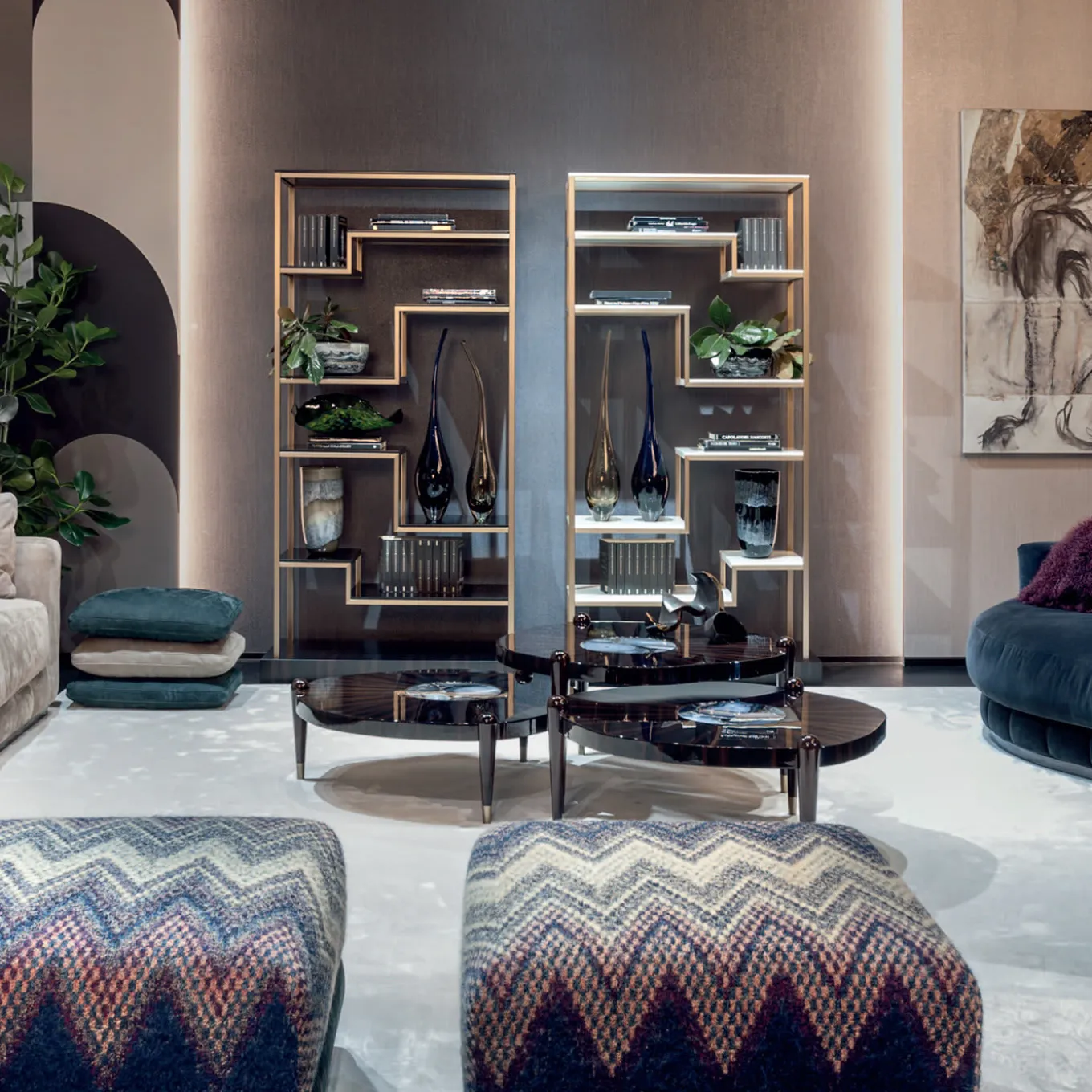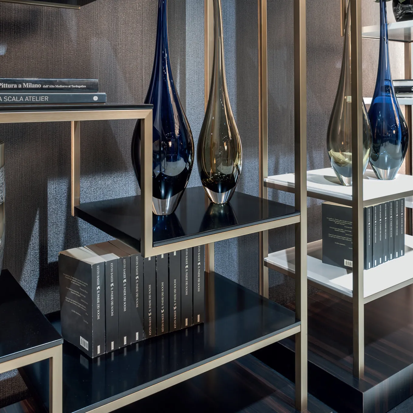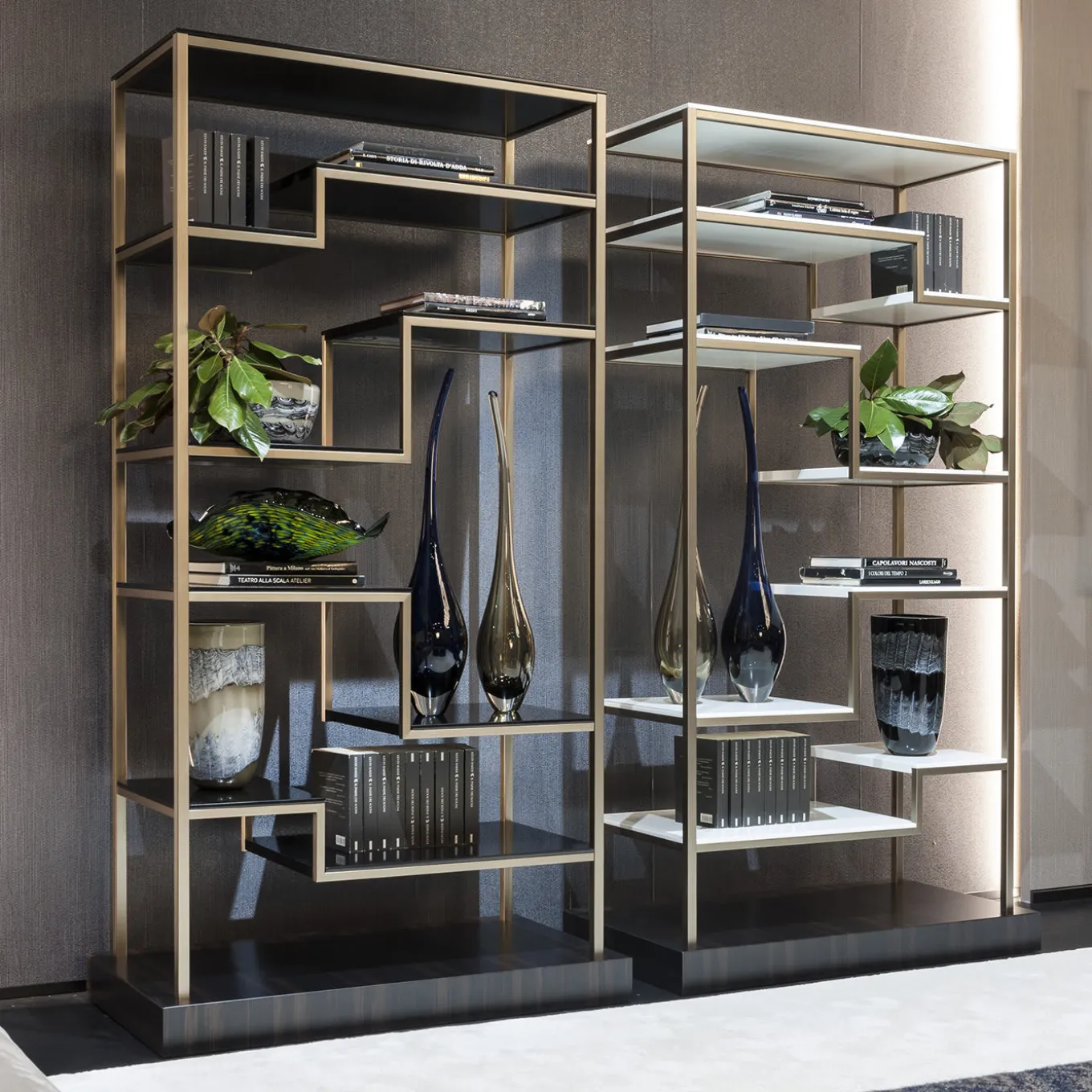 Of mid-century inspiration, the Jazz Bookshelf blends retro touches with a contemporary feel. On a dramatic ebony wood base with a matte finish, the bookshelf is made in bronze-tone metal with your choice of black or white shelves. Thanks to the stair-like shelves, the bookcase is perfect for displaying vases and photos as well as your favorite titles.