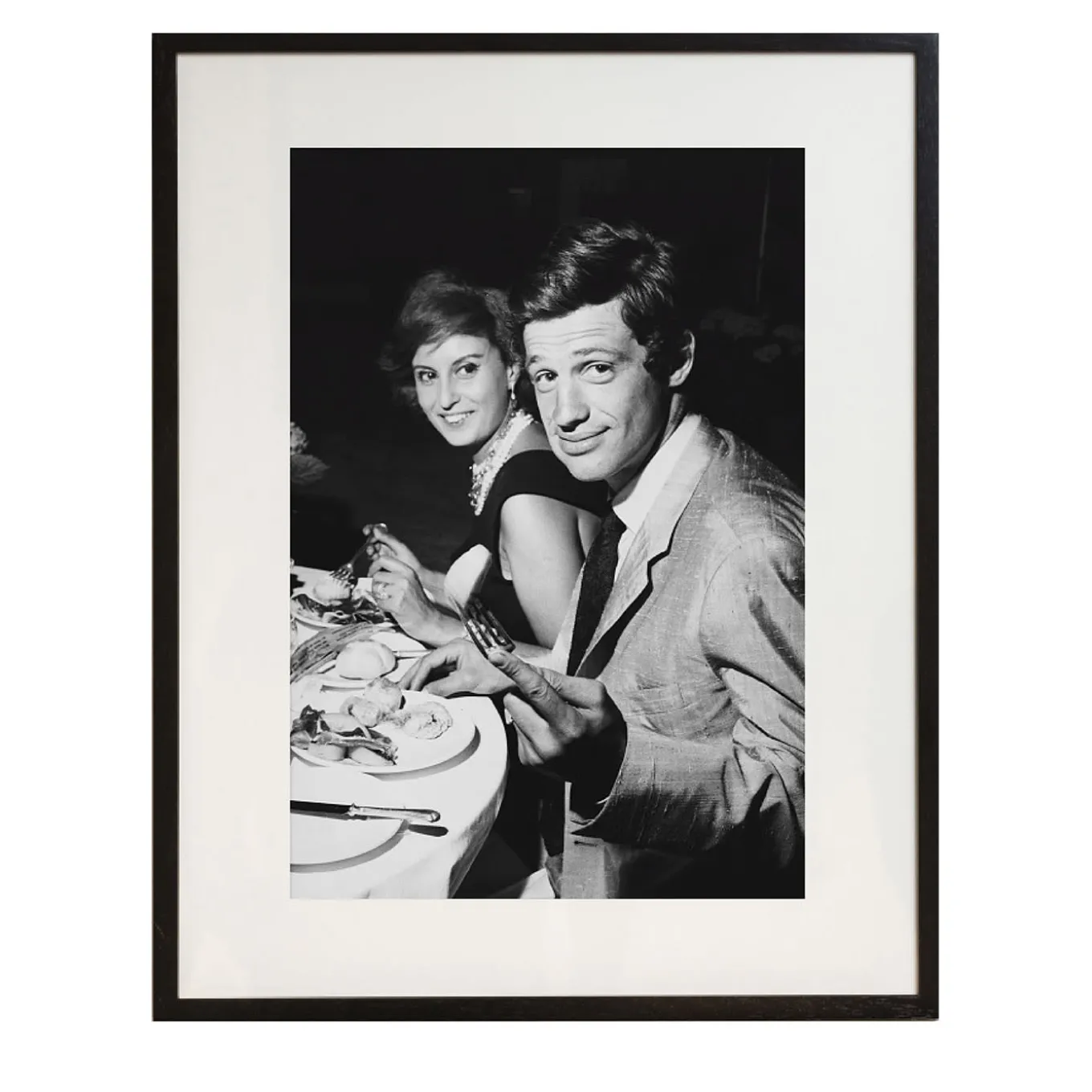 French actor Jean-Paul Belmondo with a friend in the Via Veneto, Rome, Italy, during the filming of ‘Letters By a Novice’ (‘Lettere di una novizia’), in 1960. This pigment print on baryta paper is from the Classic Cinema Celebrities collection and it includes a traditional wood frame. Print size is 10×12″/ 25×30 cm and frame size is 15x17x2″ / 38x43x5 cm. Photo by Keystone/Hulton Archive/Getty Images. Accompanied by certificate of authenticity.