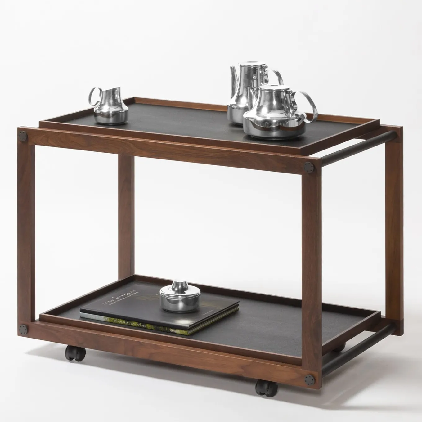 Wood structure is available in different finishes featuring fine leather and metal inserts. Provided with two removable trays and omnidirectional wheels. Different walnut wood and metal finishes are available upon request.