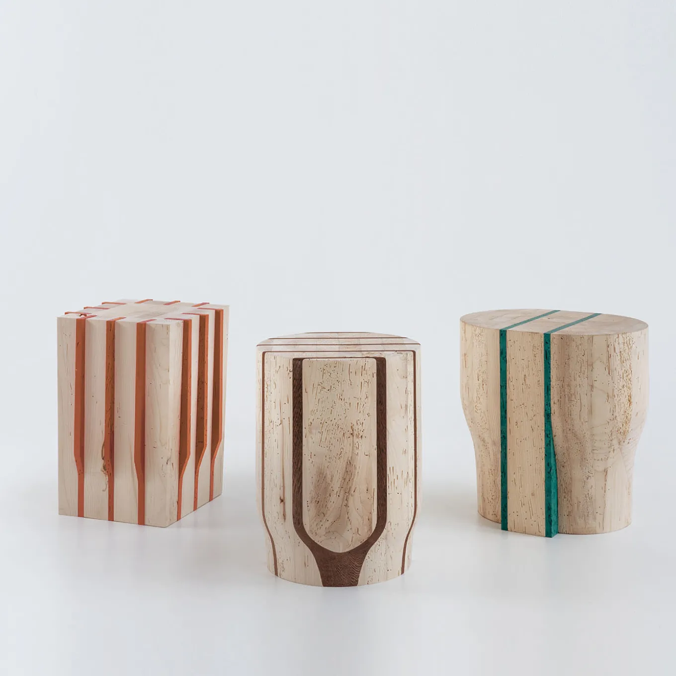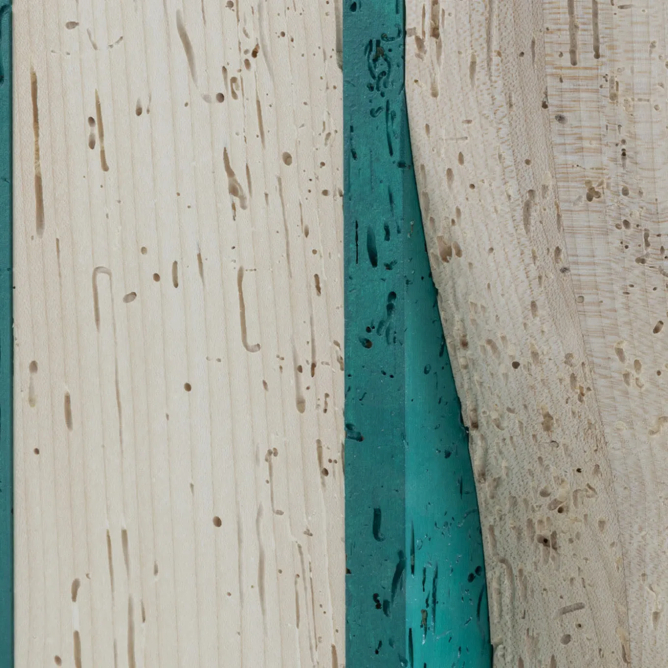 This collection features three works that explore the dynamic relationship between a solid mass of imperfect reclaimed wood and intricately layered compact wood. The interweaving colors and textures create captivating geometries that transform the original material volume. Crafted from natural recovered wood, colored green, each piece is part of the “La stanza delle Necessità” collection and handcrafted. Please note that as natural materials are used, the final effect may vary from the picture.