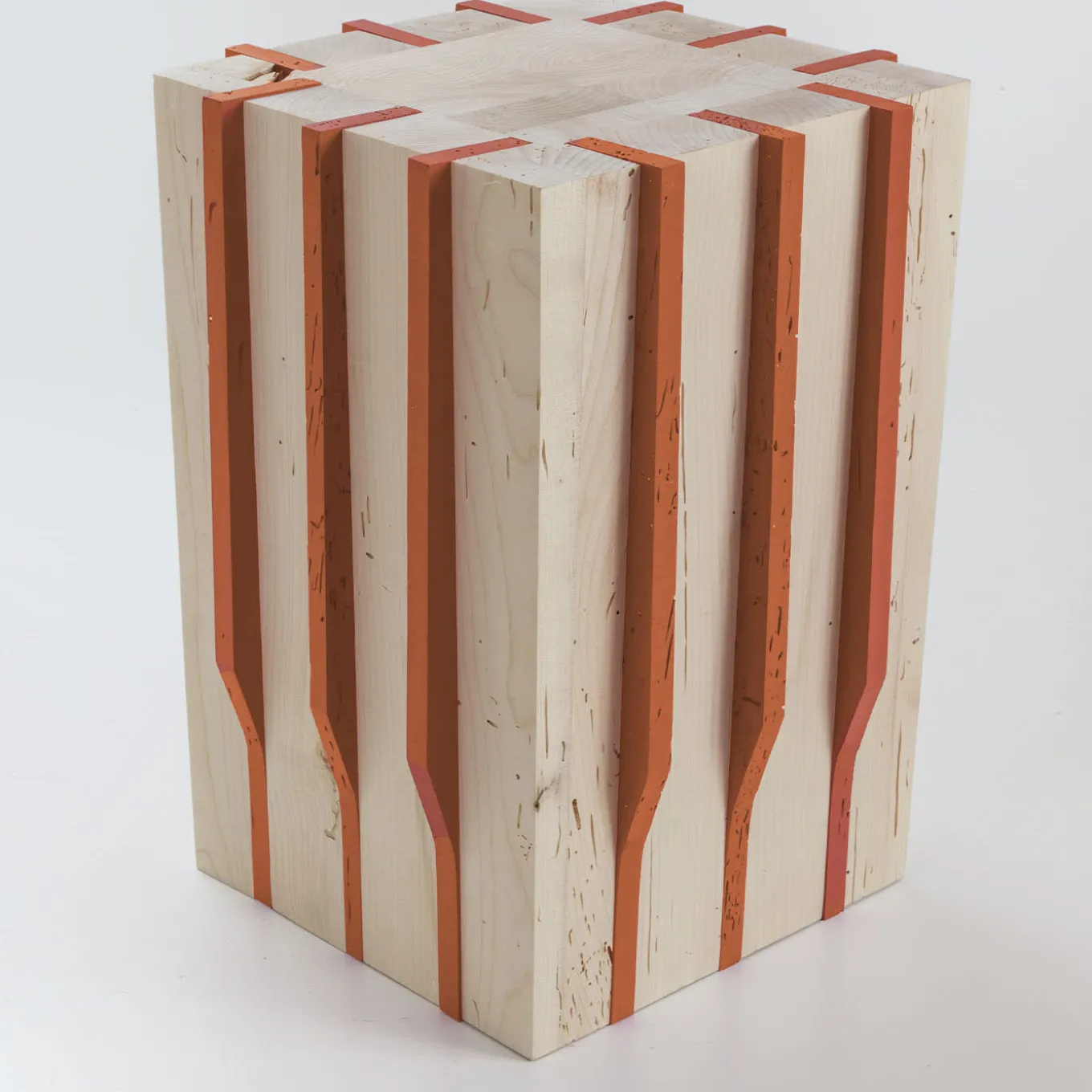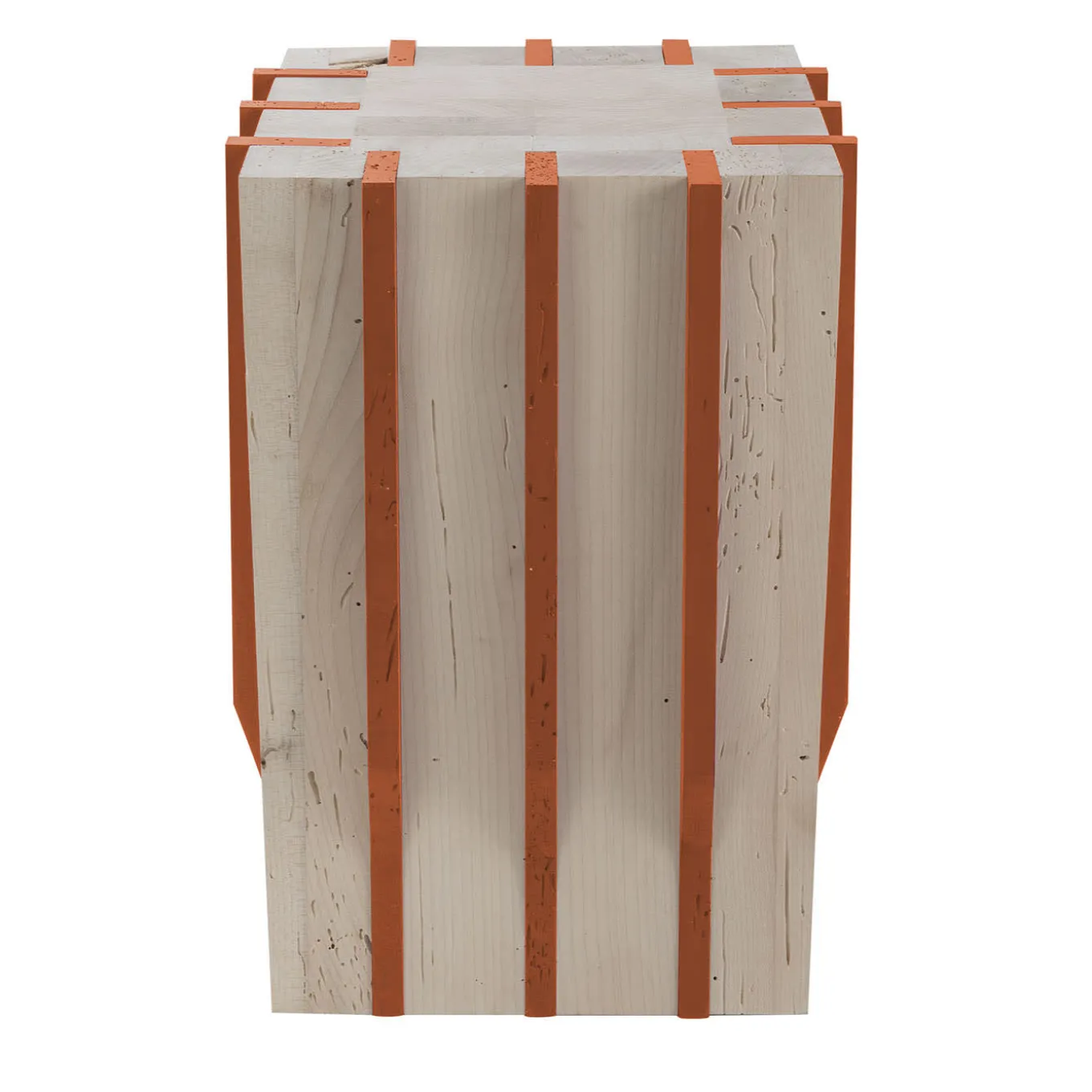 This collection features three works that explore the dynamic relationship between a solid mass of imperfect reclaimed wood and intricately layered compact wood. The interweaving colors and textures create captivating geometries that transform the original material volume. Crafted from natural recovered wood, colored orange, each piece is part of the “La stanza delle Necessità” collection and handcrafted. Please note that as natural materials are used, the final effect may vary from the picture.