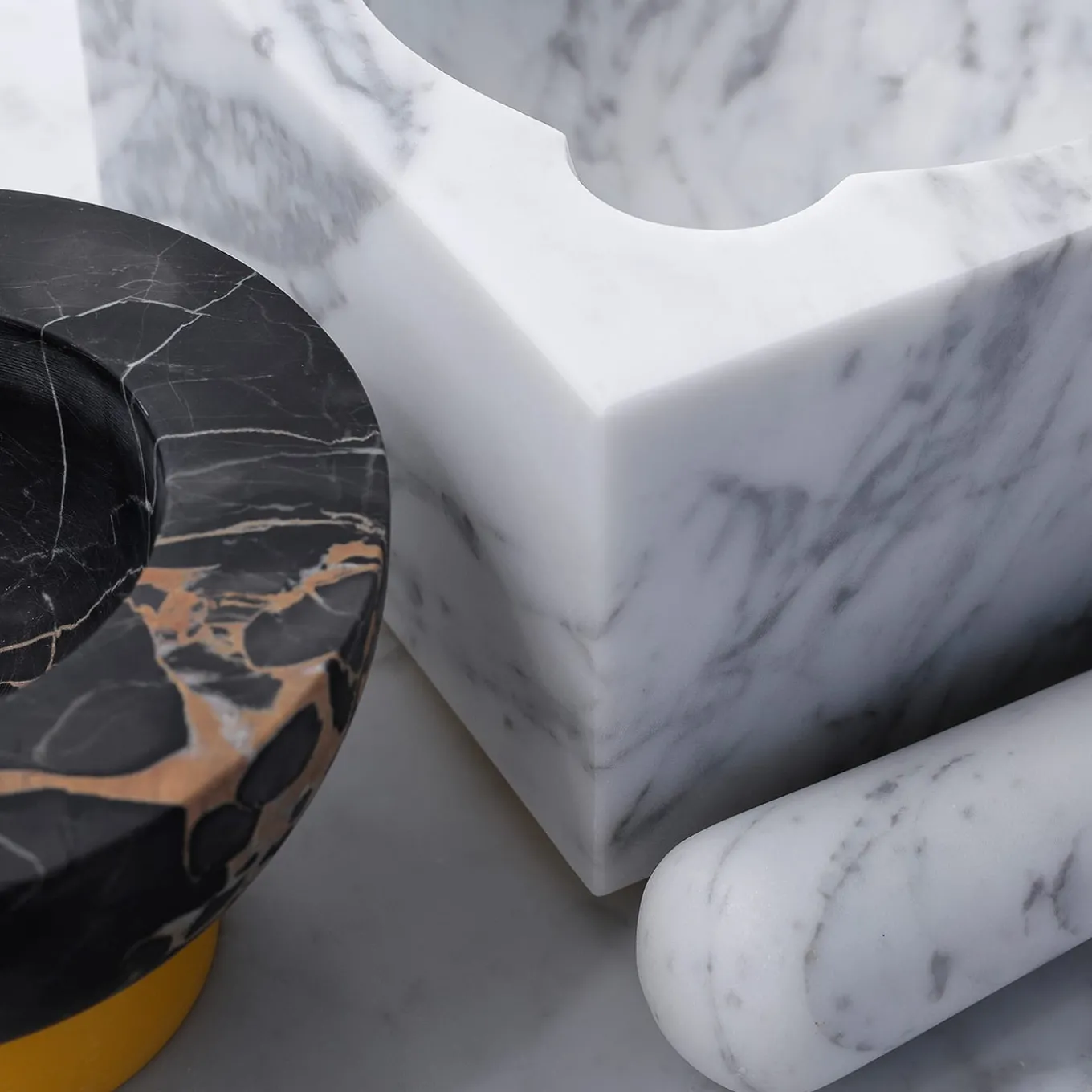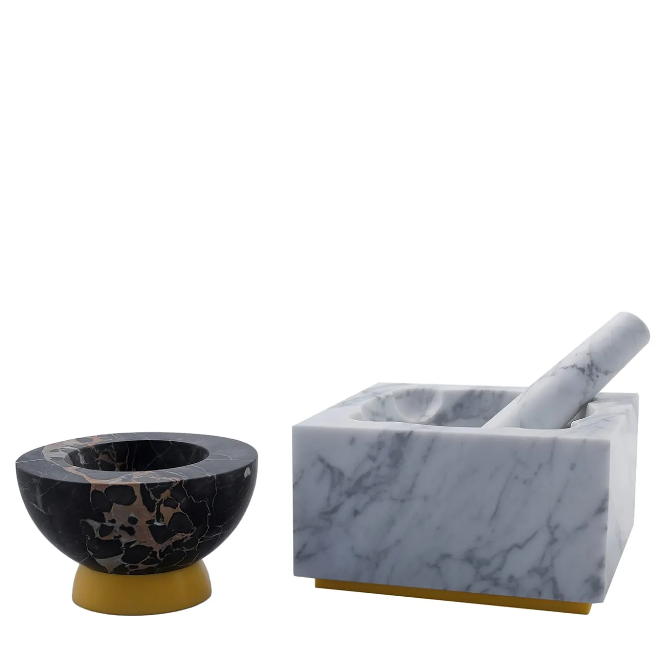 Designed by Mara Capetta, the J&J set is a modern interpretation of the classic cooking accessory traditionally used in the preparation of pesto. The set comprises 2 mortars, a large one in White Carrara marble and a small one in Portoro Vena Gold; the size of the mortar to use is determined by the ingredients to grind, whether salt and pepper to chili peppers and garlic. A superb housewarming gift, this set will be the standout piece in any kitchen.
