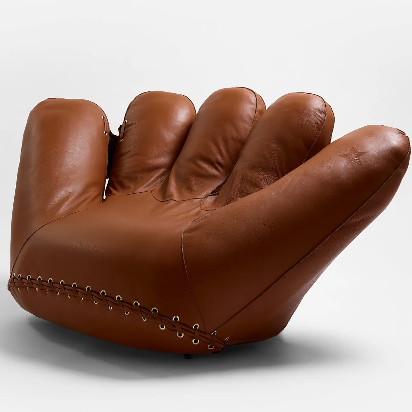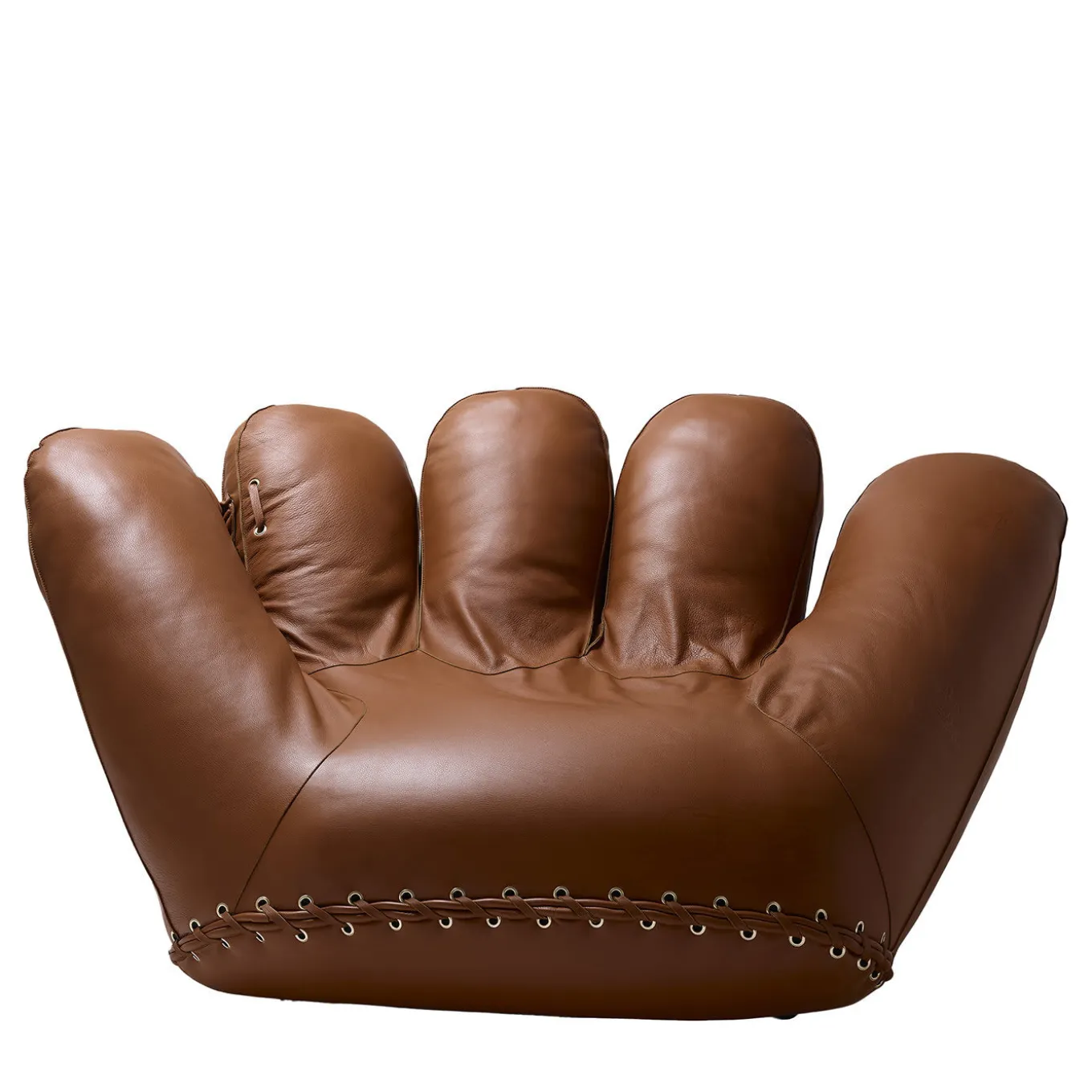 An iconic and bold design that pays tribute to American baseball champion Joe DiMaggio, this extraordinary armchair features the shape of a huge and embracing baseball glove. The perfect complement to the Joe Ball Pouf, its Pop Art-inspired character is enhanced with brown leather upholstery. Softly padded with preformed polyurethane foam, it rests on a metal frame.