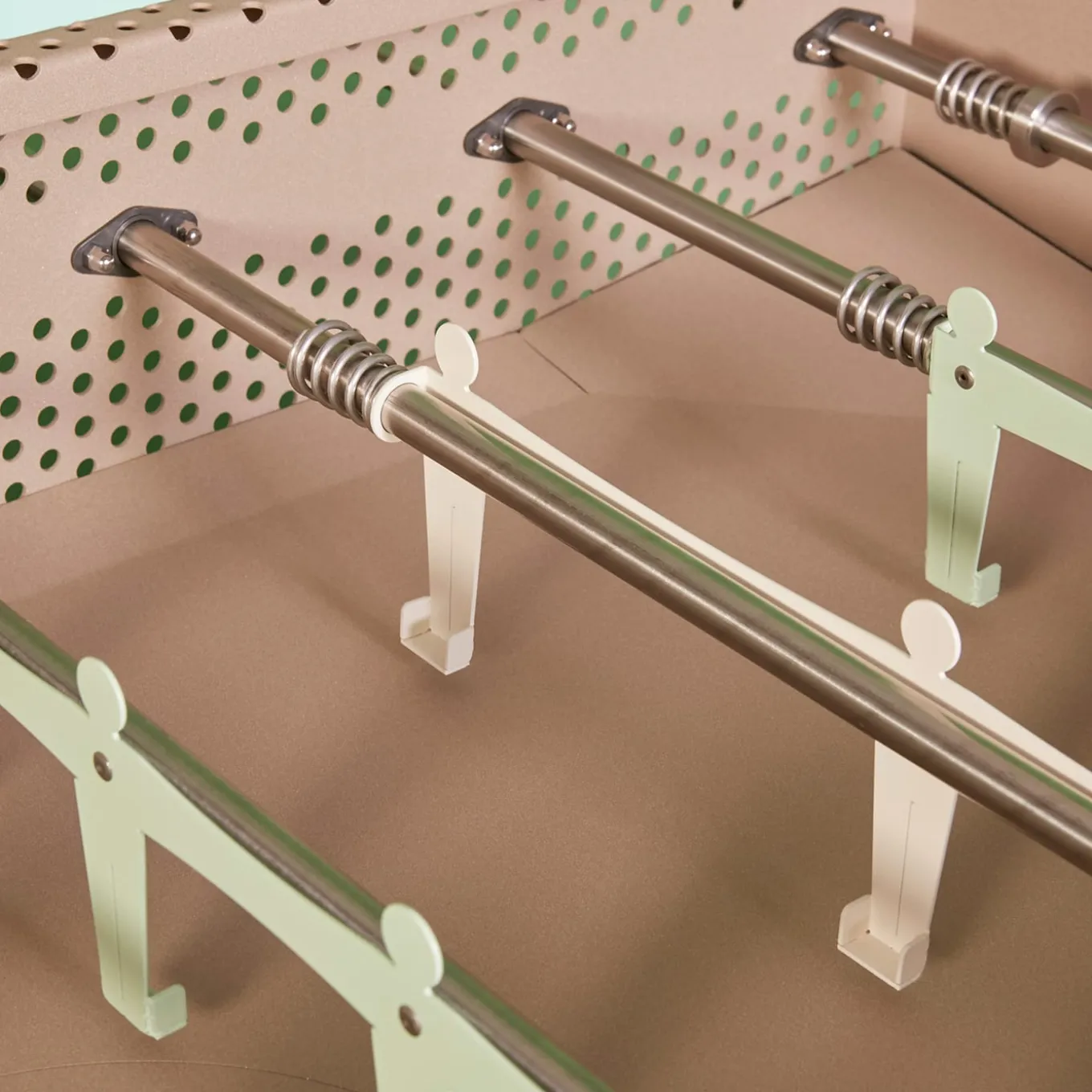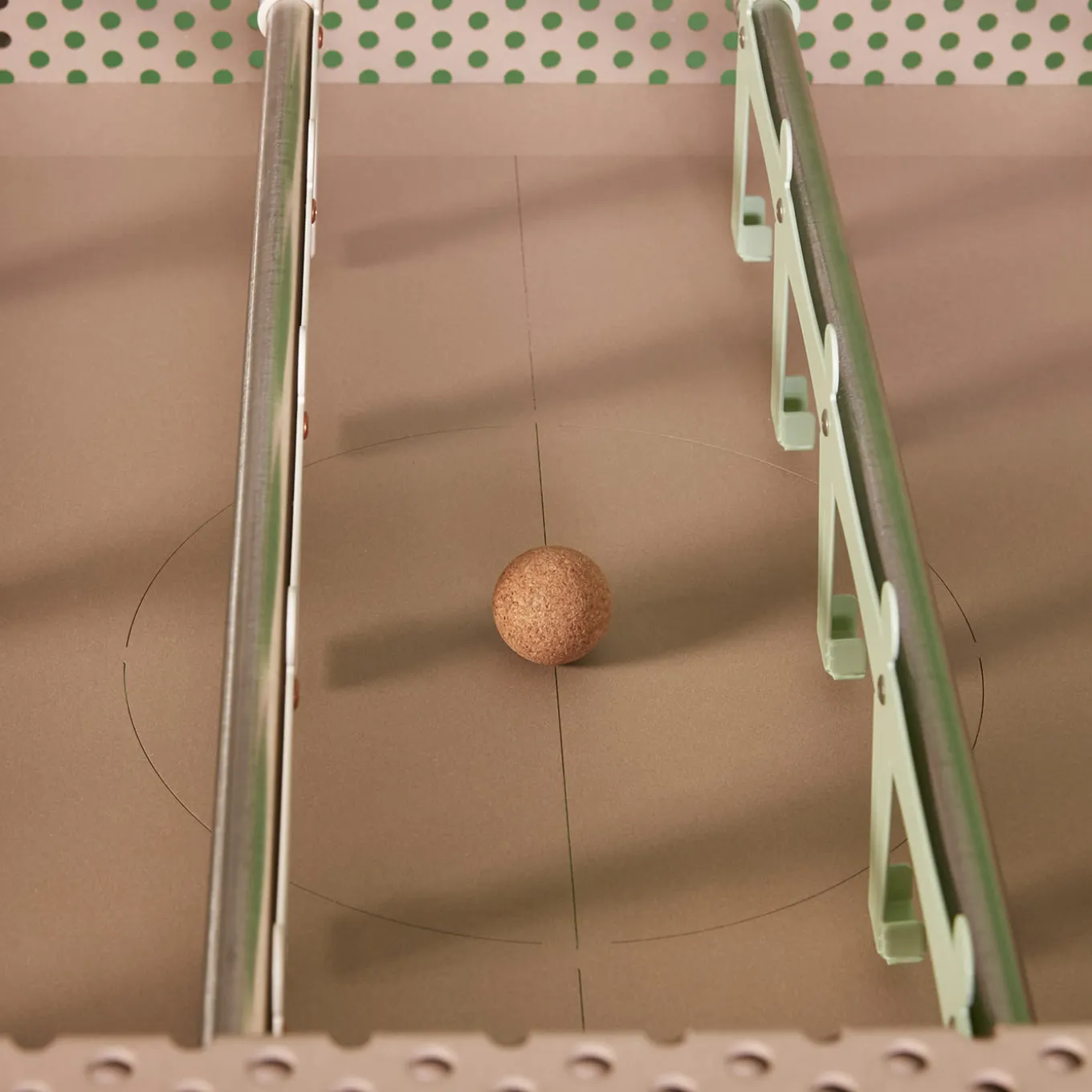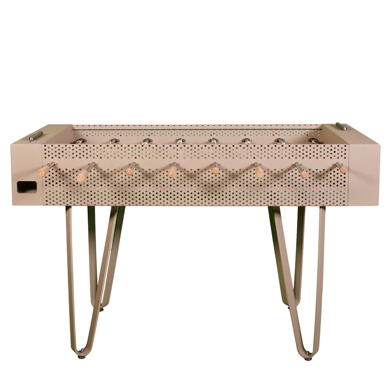 The Joie table football in sand features an elegant perforated sheet metal body in a soft, neutral tone, paired with gray and fuchsia players. Designed with careful attention to detail, it includes cork grips and a cork ball for a comfortable and tactile playing experience. Entirely made of metal with stainless steel components, it stands on sleek legs that ensure both stability and a refined, modern look. An outdoor version is also available. Other color options are listed in the Artemest catalog. Please contact the Concierge for more details.