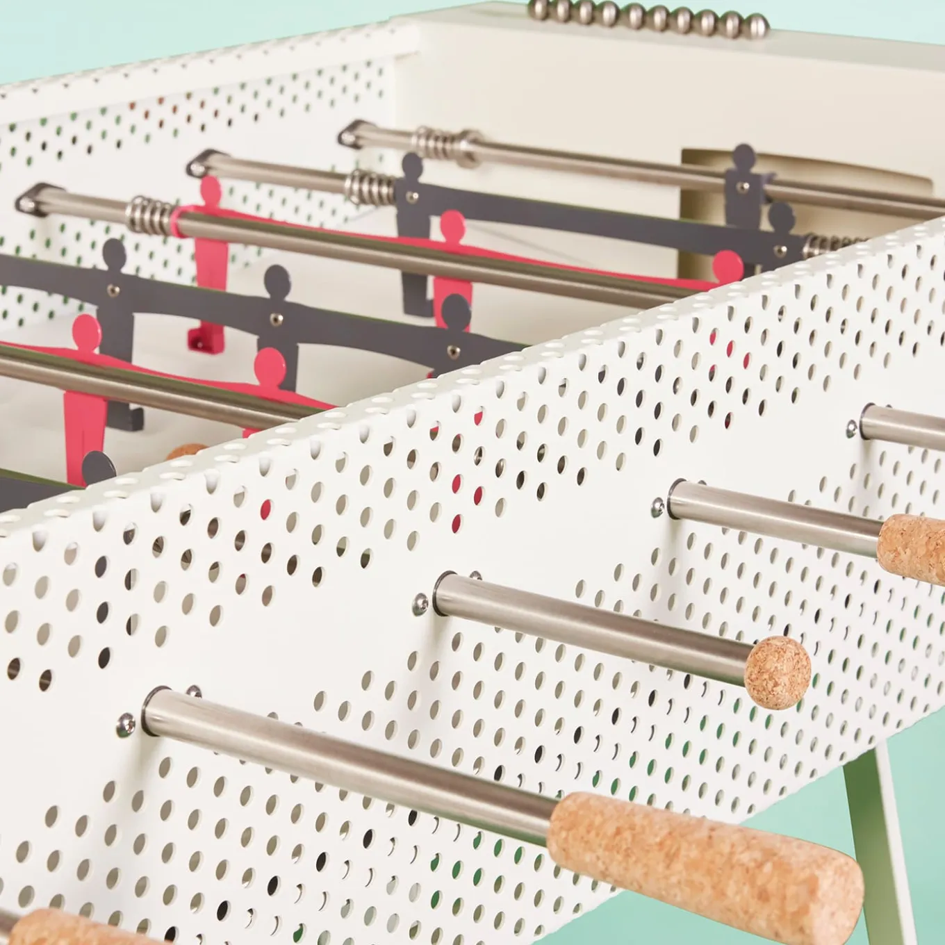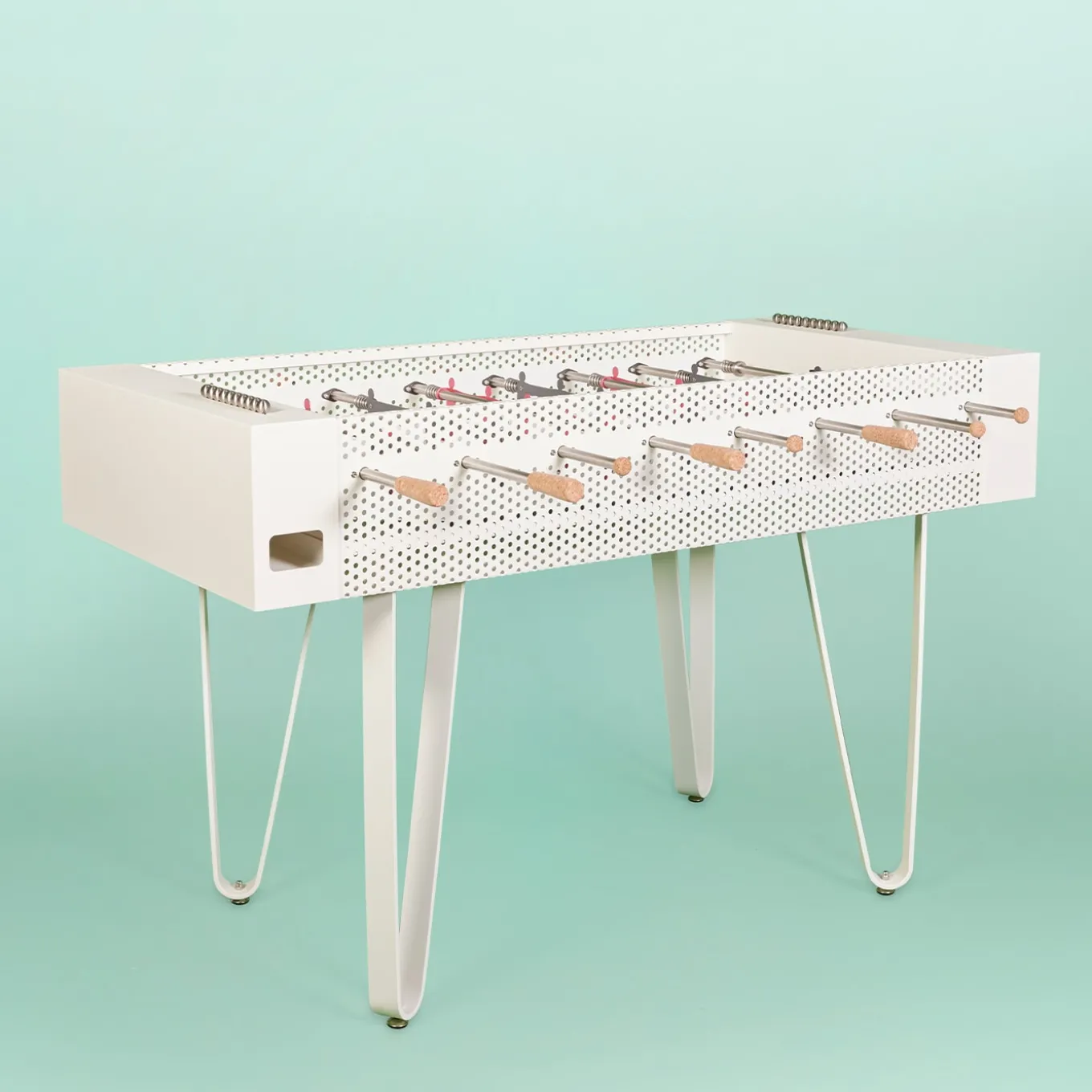 The Joie table football combines an elegant white perforated sheet metal body with gray and fuchsia players. It features meticulous details including cork grips and ball for enhanced comfort and tactile experience. Constructed entirely from metal with stainless steel components, the table stands on sleek legs offering stability and modern appeal. An outdoor version is also available, making it a refined choice for design-conscious gaming spaces. Other color options are available in the Artemest catalog. Please contact the Concierge for more details.