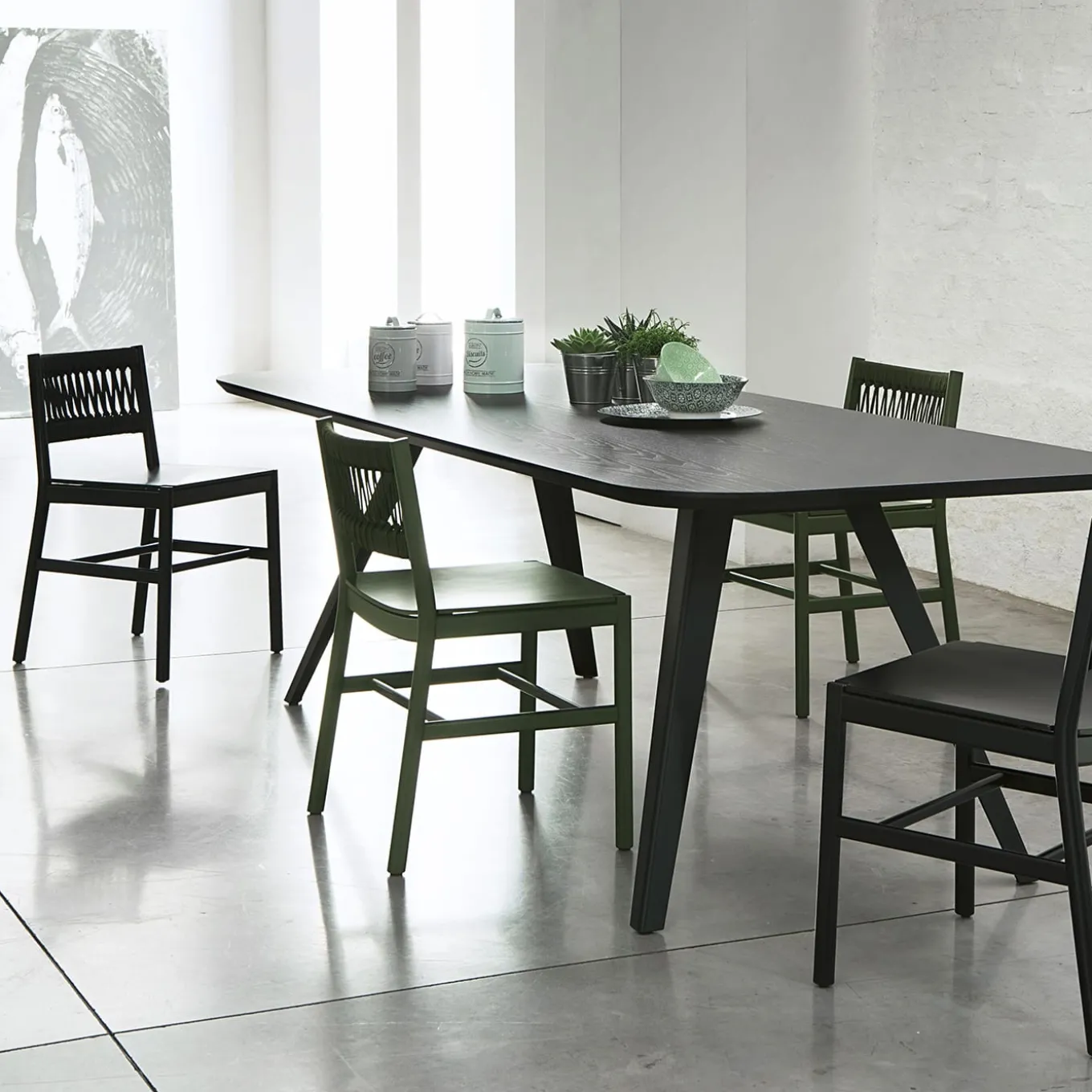 Distinguished by a fascinating backrest decorated with green rope col. 18, this refined and elegant design by Emilio Nanni reinterprets the archetypical chair in a contemporary key. Available in a wide range of colors, it is handcrafted of green-lacquered wood (RAL 6003). Please ask the Concierge for customizations options and further details.