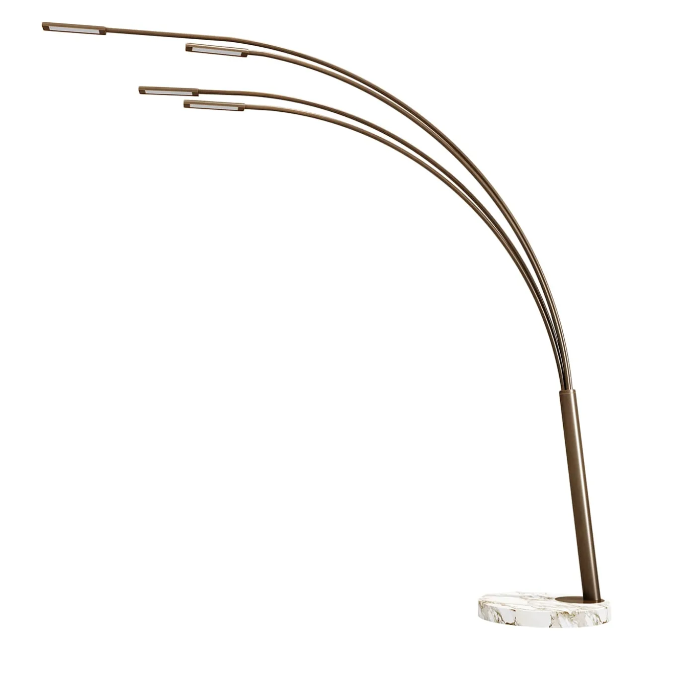 The Juncos floor lamp is an elegant lighting fixture featuring four slender brass branches gracefully extending from a circular white marble base. Each branch is equipped with integrated LED strips, providing efficient illumination. The lamp is operated via a floor-mounted pushbutton panel, and a dimmable version is available upon request. For more information, please contact the Concierge.