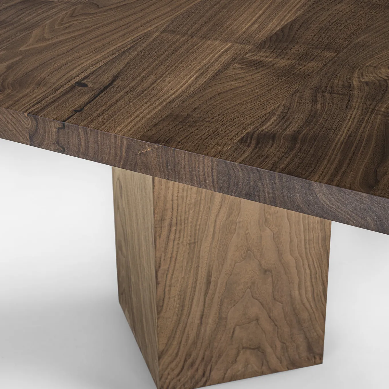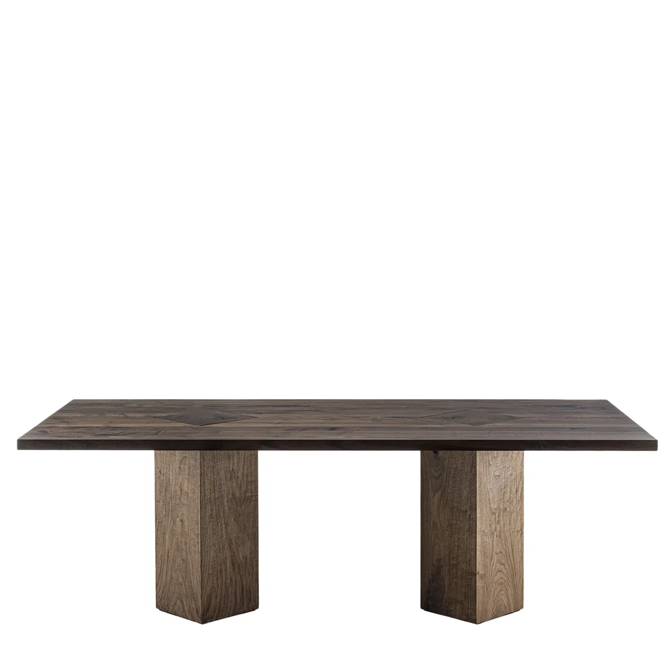 The Junior B dining table features a top crafted from glued solid wood strips, showcasing natural knots and an oiled finish. The design highlights distinctive leg details that extend visibly above the tabletop, made from sections of tree trunks rotated at a 45° angle. The table balances a robust and refined aesthetic. Designed by Authentic Design.
