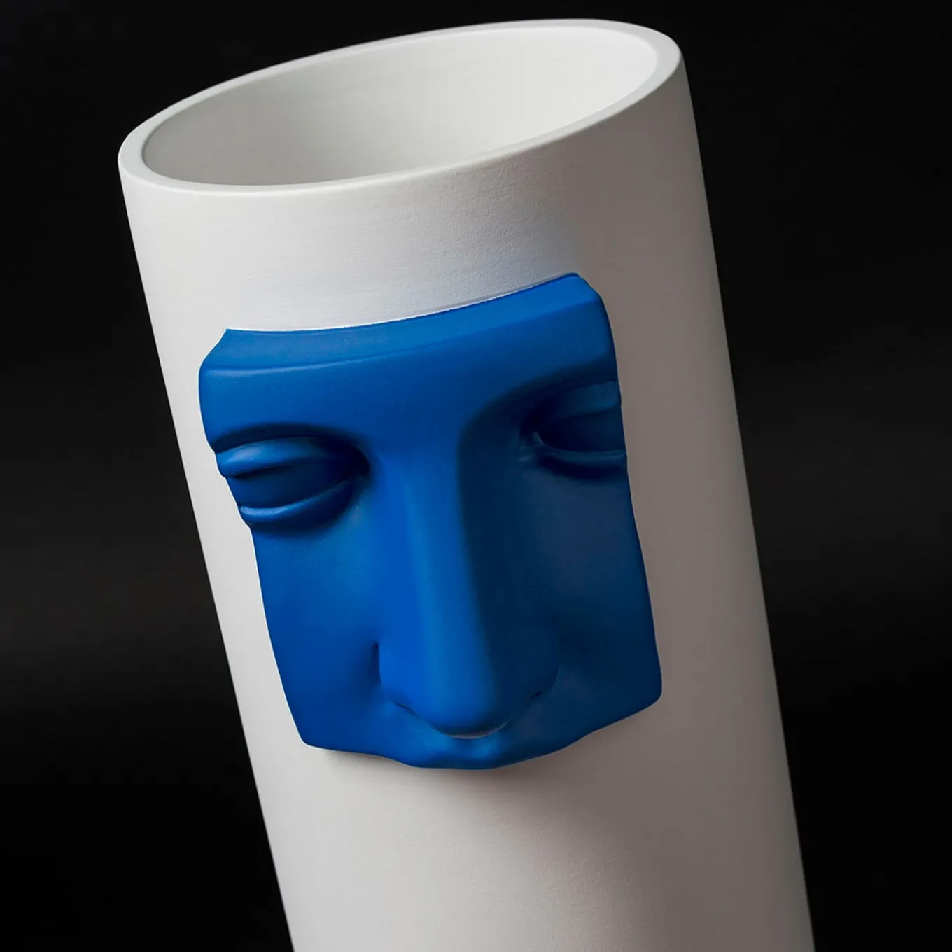 Classic Italian art and modern design stunningly merge in this sophisticated piece: a clean, cylindrical white ceramic vase decorated with a vivid blue insert recreating the nose of timeless, unmistakable representation of Juno as depicted in classical and neo-classical sculpture. This evocative piece will effortlessly infuse a touch of sophistication into both modern and minimalist interiors.