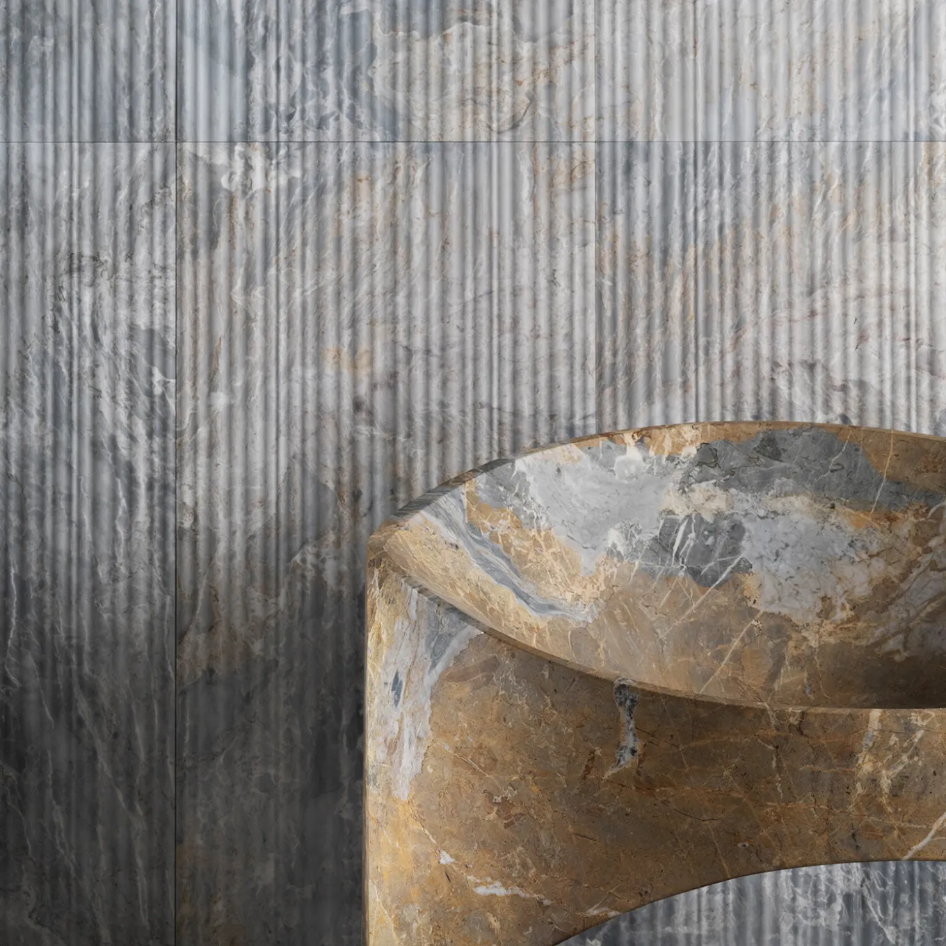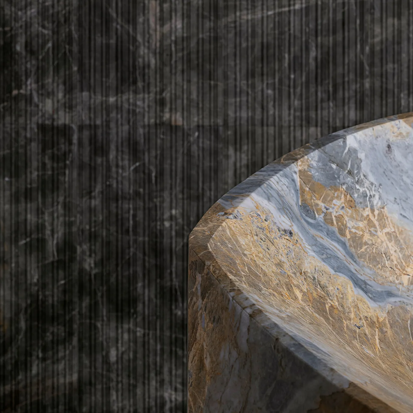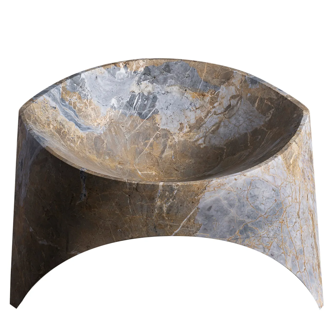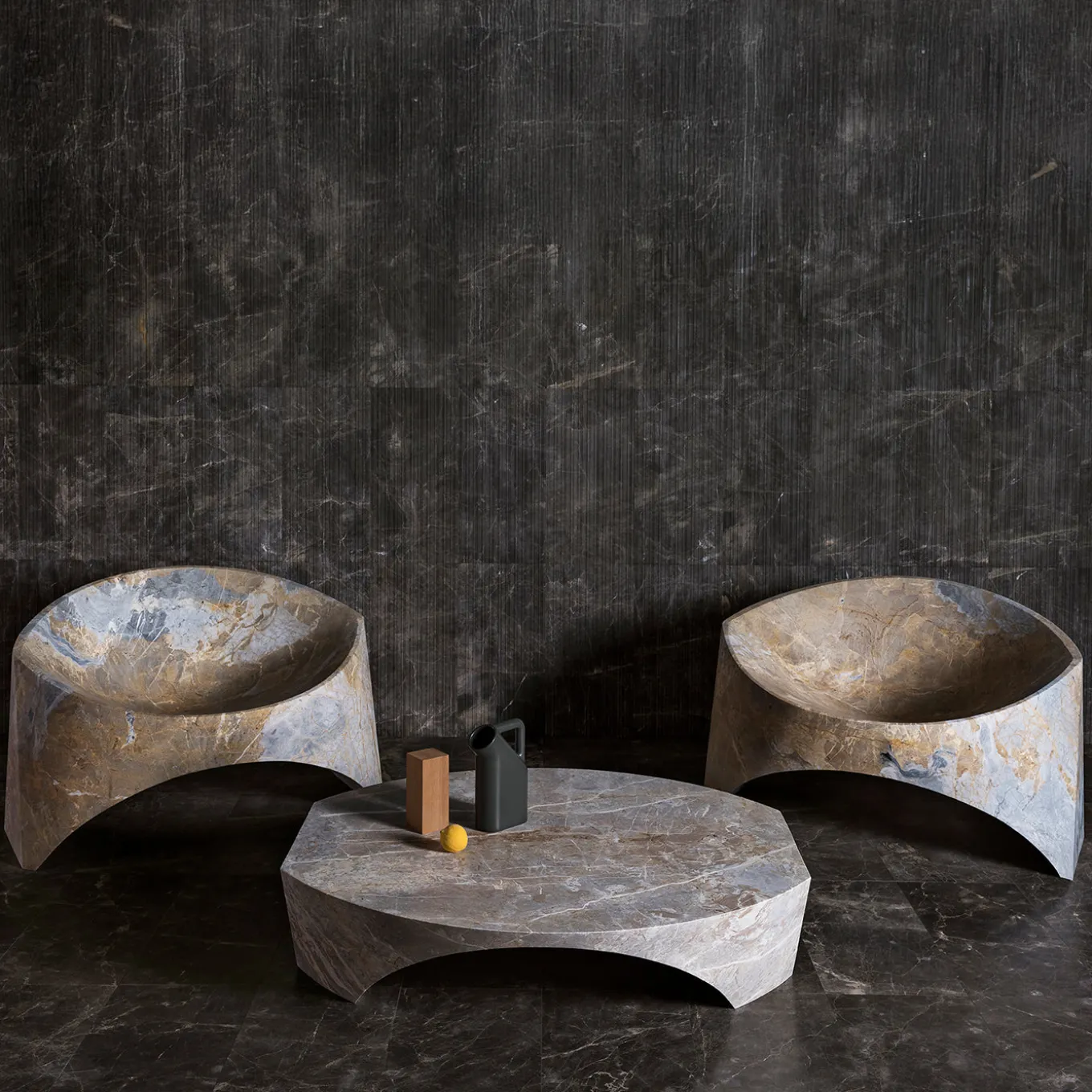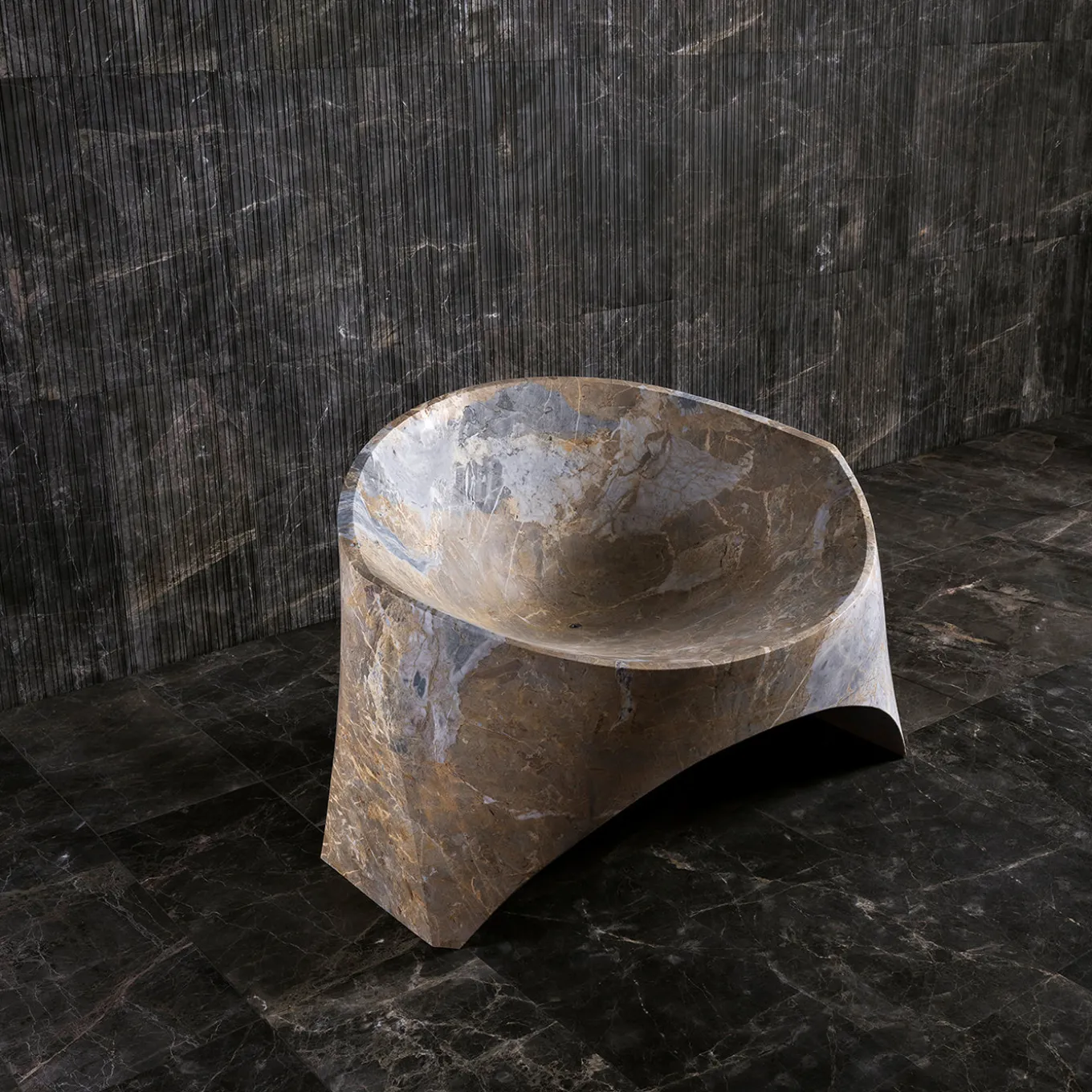 The Kairo chair by Karim Rashid features a sculptural design carved from a single block of marble, with smooth continuous surfaces and evolving volumes. Its distinctive double-arched form draws inspiration from an Egyptian journey. Precision-cut and polished by specialized machinery and hand finishing, the chair combines bold aesthetics with practical durability, suitable for both indoor and outdoor use. This seamless monolithic piece celebrates the natural elegance of marble in contemporary living spaces.