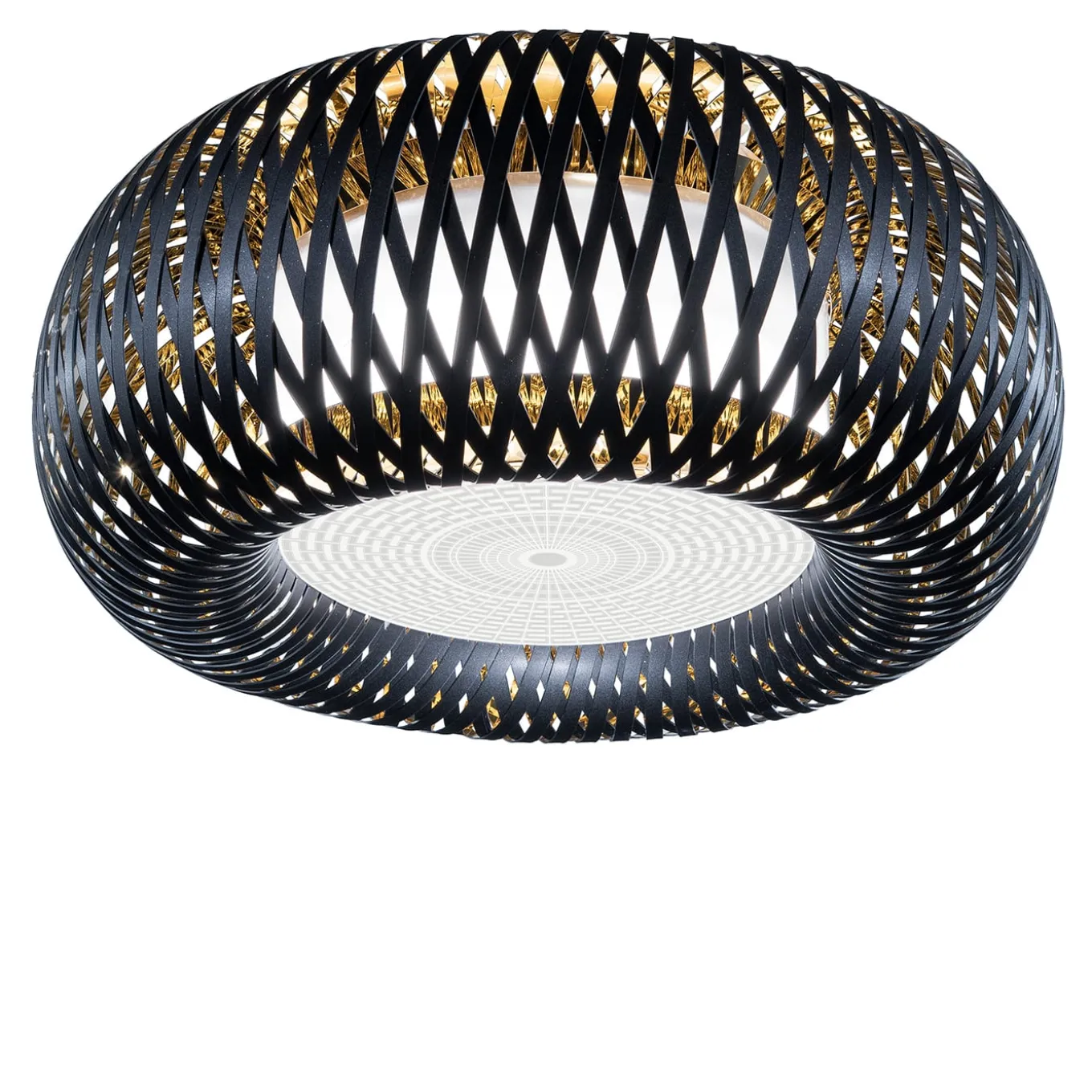 Inspired by the art of weaving, part of humanity from prehistoric times in the form of baskets and cane sacks, Kalatos revisits these archetypes with a modern take using Slamp’s advanced technopolymers; the collection has both suspension and ceiling versions. This lamp version is matte black with an internal gold finish.
