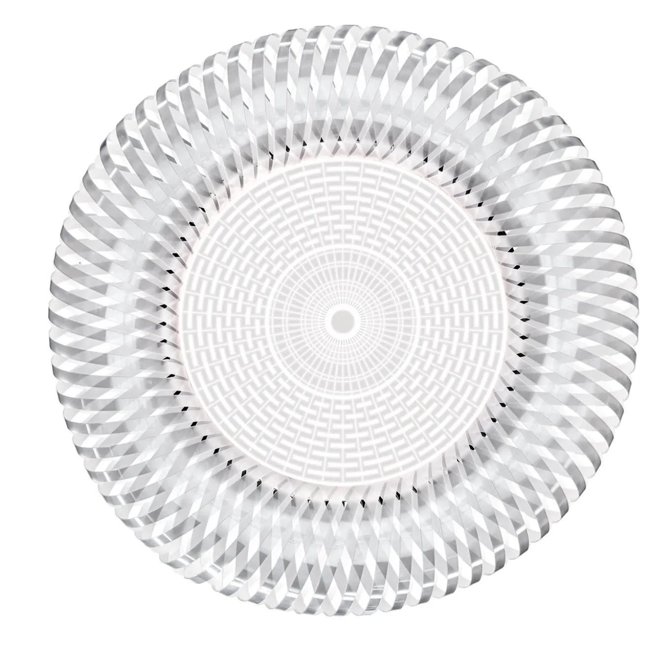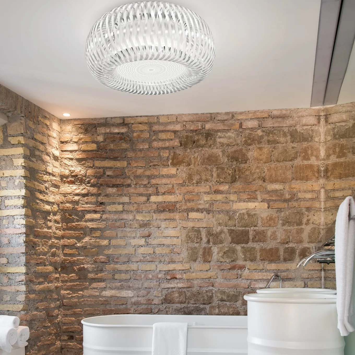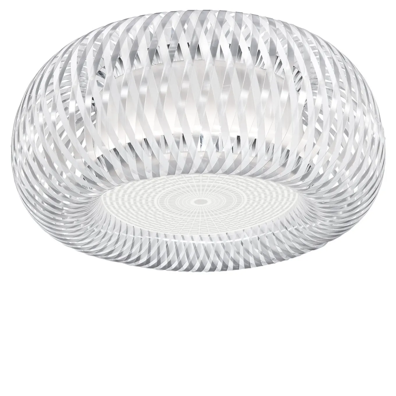 Inspired by the art of weaving, part of humanity from prehistoric times in the form of baskets and cane sacks, Kalatos revisits these archetypes with a modern take using Slamp’s advanced technopolymers; the collection has both suspension and ceiling versions. This lamp version is white with transparent Lentiflex.