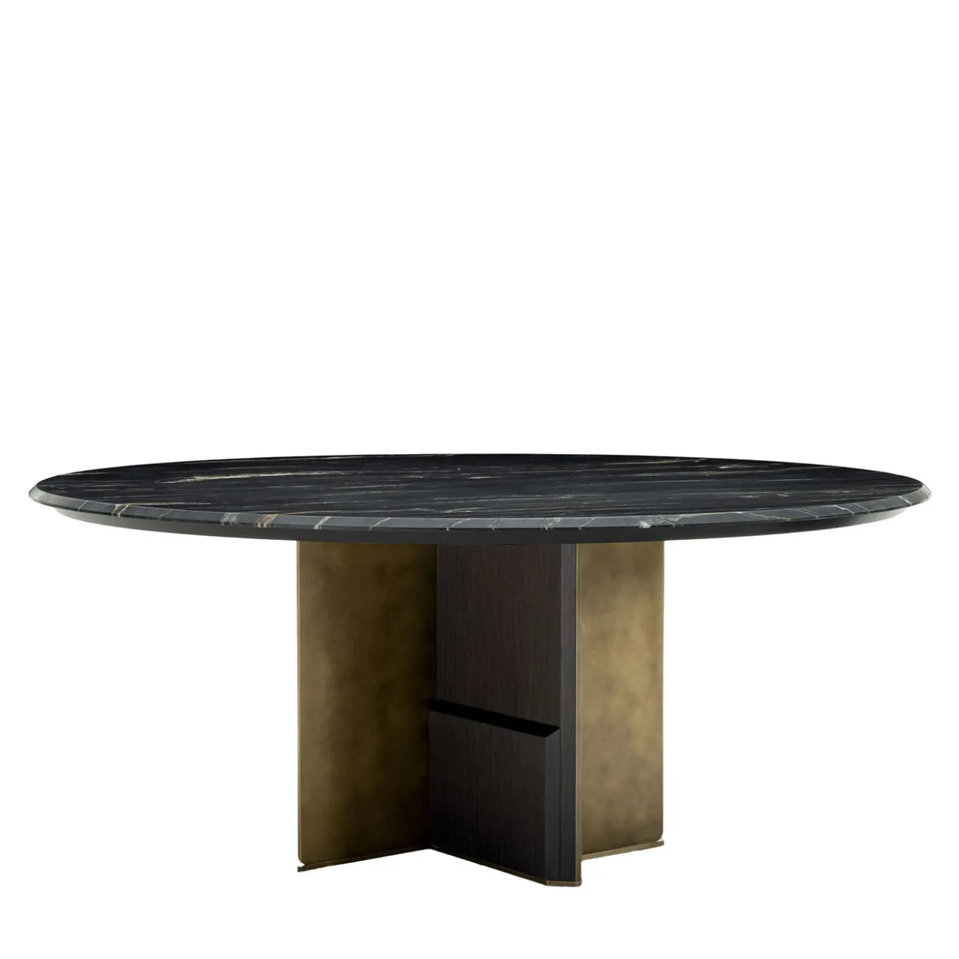 A dining table featuring a round Belvedere marble top with elegant striations. The base combines striped grey wood panels with a cloudy gold metal finish, creating a sophisticated contrast. The design includes a spacious surface option with an available lazy susan top for added functionality. This piece is suited for contemporary dining spaces seeking a blend of luxury and practicality. Designed by Castello Lagravinese Studio.