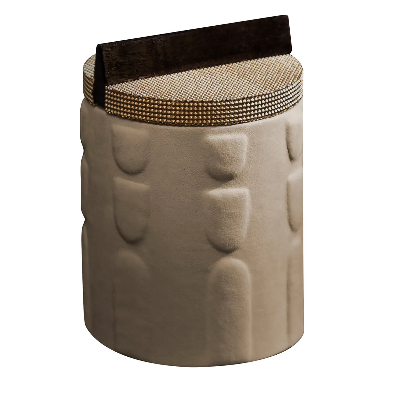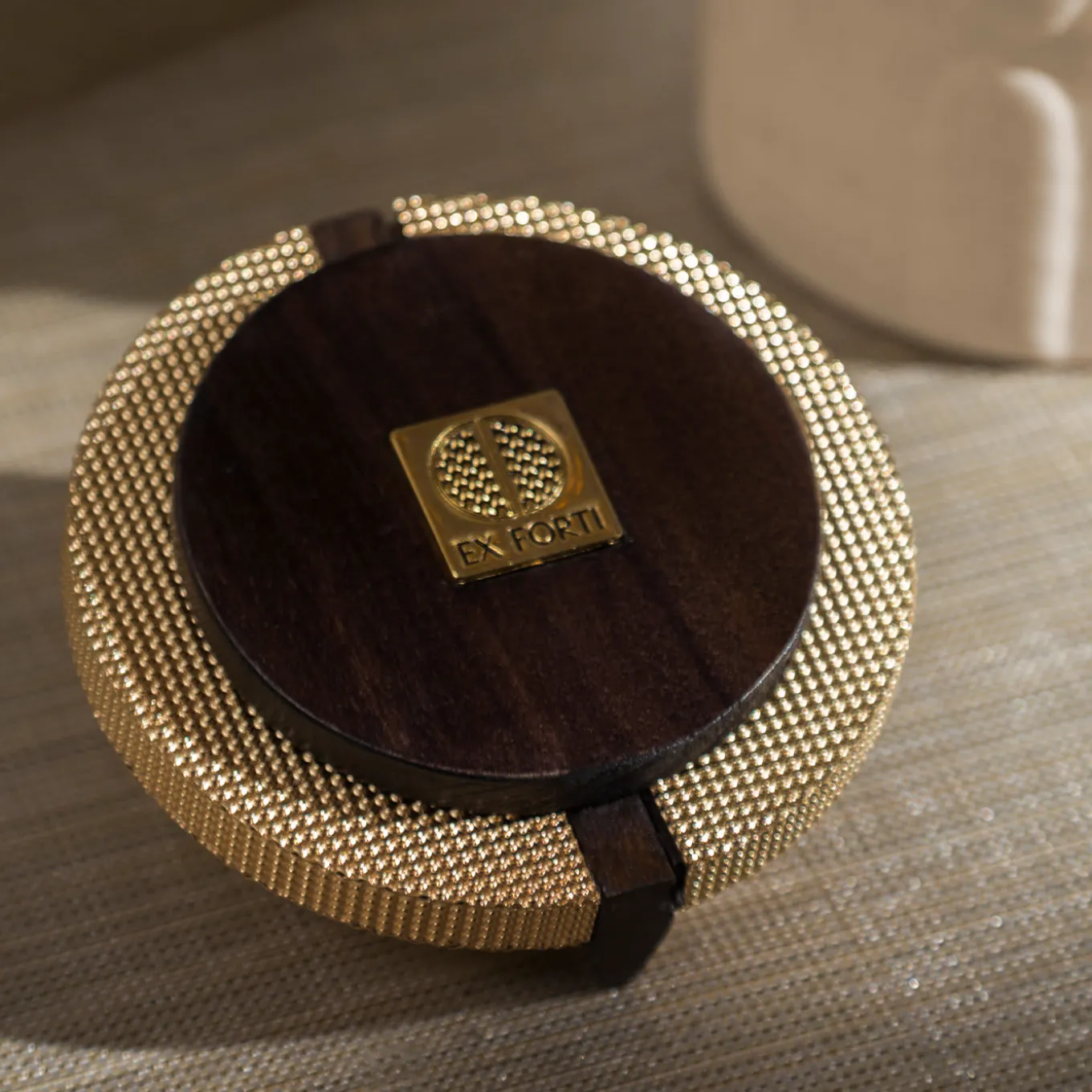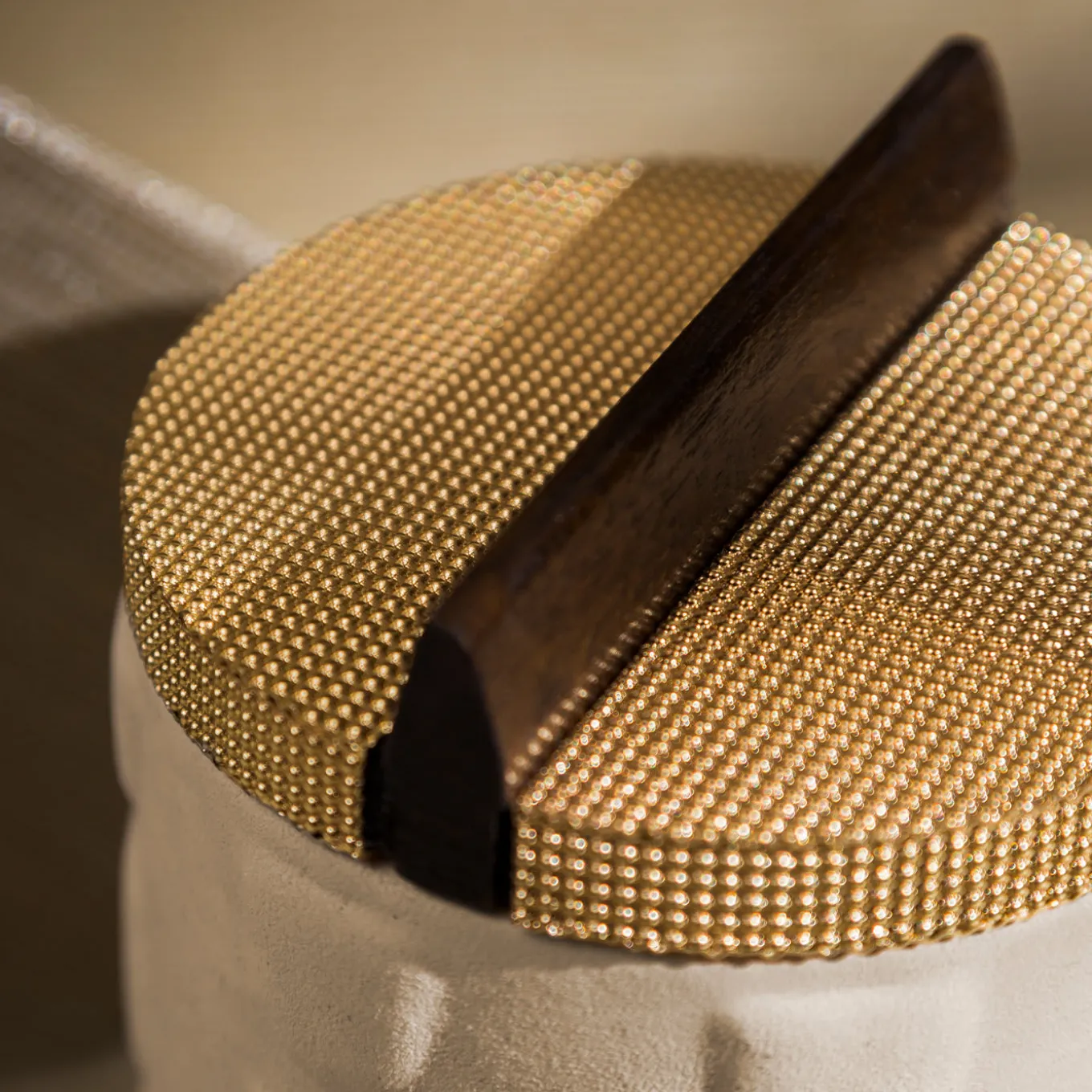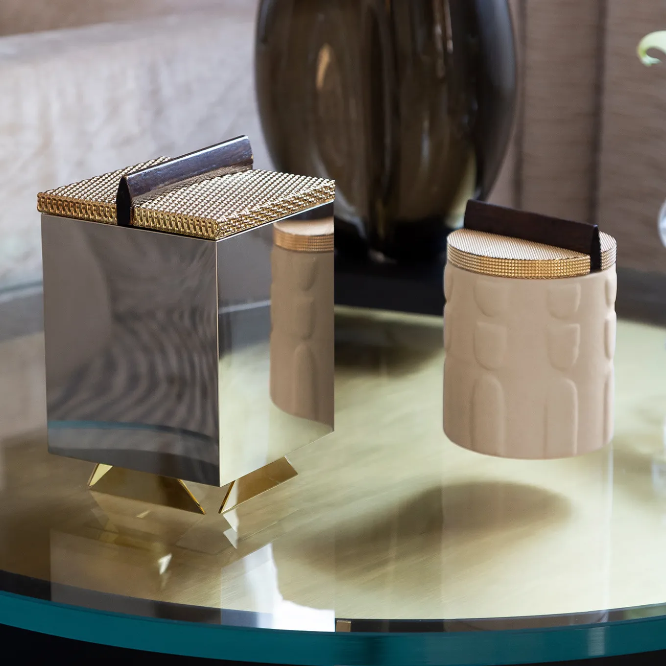 A clever synthesis of sculpture and architecture exemplified by an artisan box that is as tiny as it is precious. A raised pattern recalling pre-Columbian subjects adds textural dynamism to the cylindrical Canaletto walnut frame, upholstered in beige Nubuck leather for a superb tactile feel. The brass lid offers a superb sheen from the highly reflective links comprising the mesh design, only interrupted by the linear wooden knob whose rigor is a tribute to Rationalist lines.