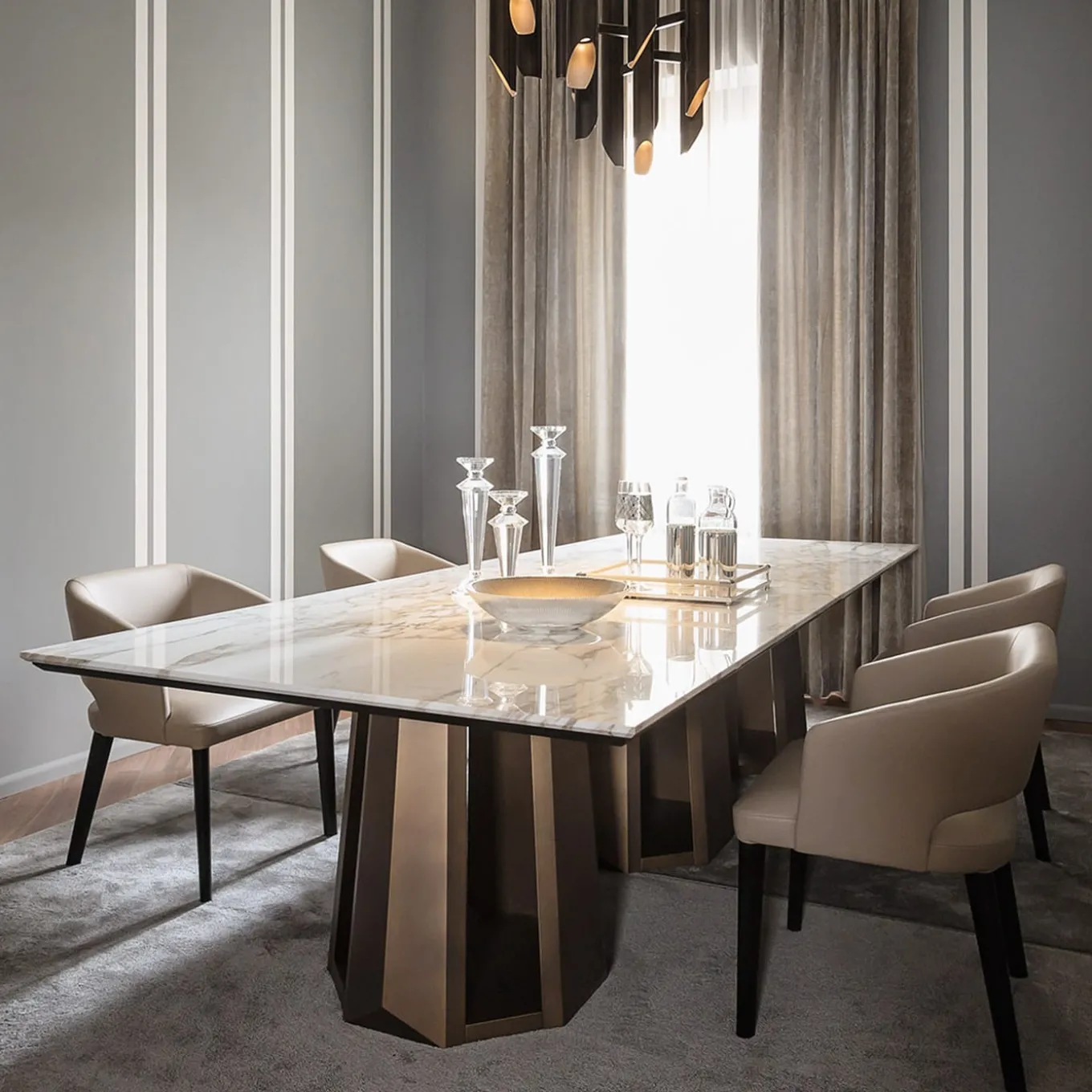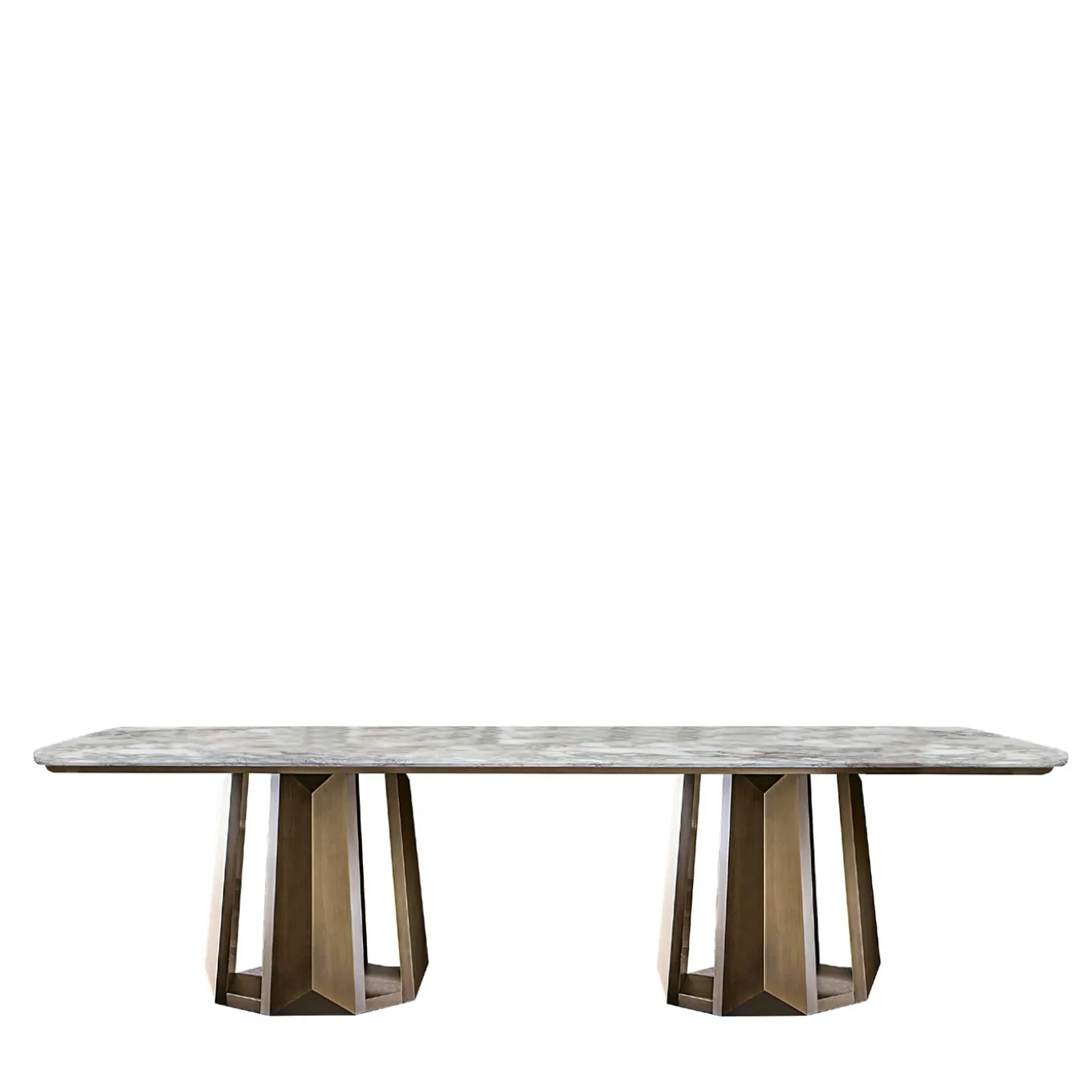 The table features a Calacatta Oro marble top with rounded edges, showcasing the marble’s luxurious veining and timeless beauty. The base is crafted from MDF and finished in a sophisticated Ottobronze lacquer, adding a modern touch. The imperfections are a result of the artisanal process, making each piece unique. A perfect combination of elegance and craftsmanship, it will elevate any contemporary spaces.