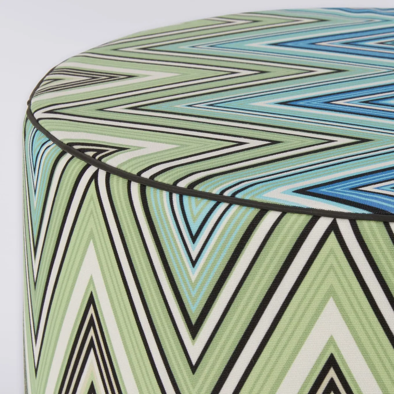 The striking dynamism of zig-zagged patterns – a signature trait of Missoni designs – meets the freshness of tones ranging from pastel green to turquoise in this stylish polyester pouf. Apt for outdoor use, it features contrasting piping along the borders that further stress its sartorial flair and harmonious geometric-inspired silhouette. A likewise contrasting branded handle completes the piece.
