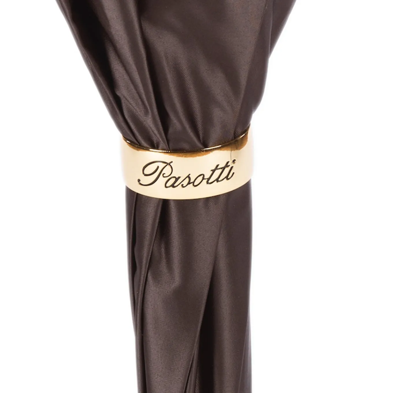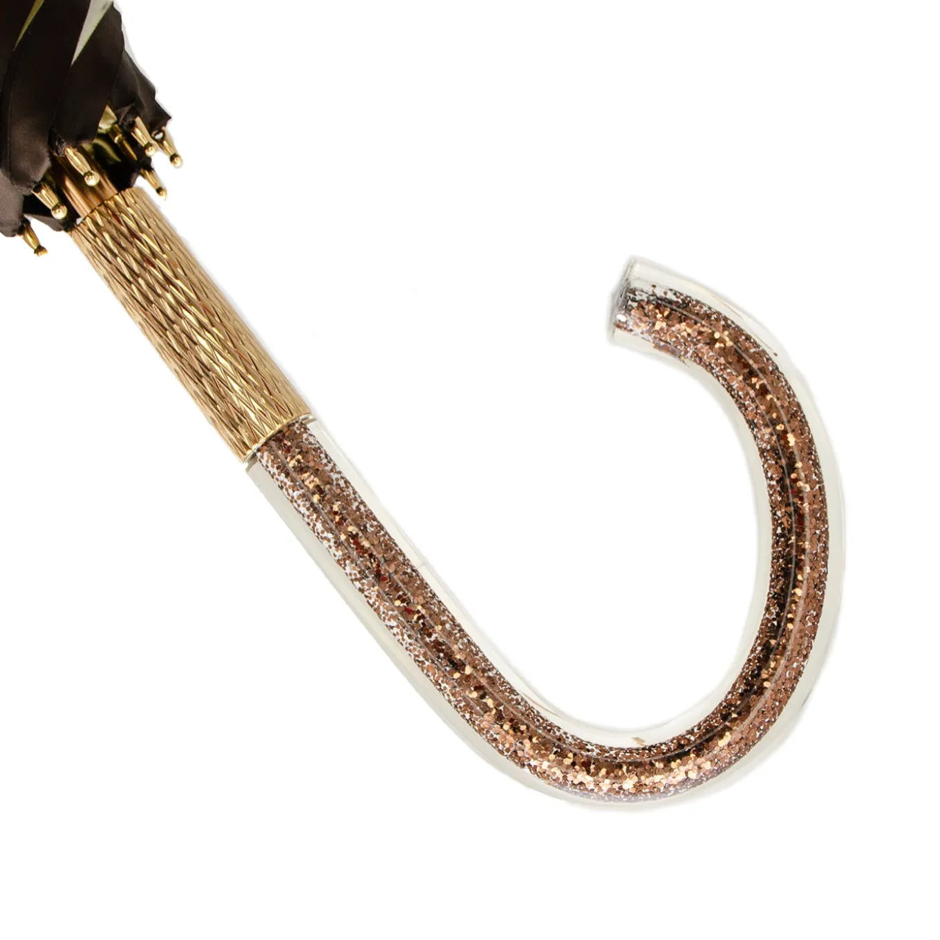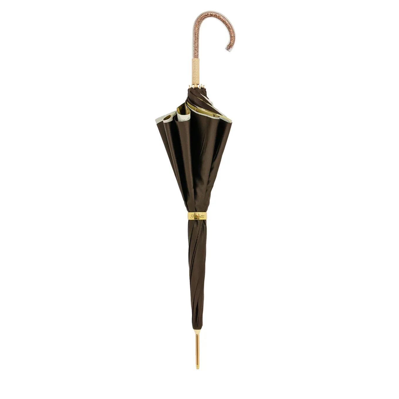 An elegant umbrella with a manual opening mechanism, featuring a khaki base delicately embellished with a subtle floral motif and shimmering glitter accents. The acetate handle, finished with a sparkling touch, adds to its refined and stylish character. A perfect blend of practicality and elegance, designed to offer reliable protection with a touch of sophistication.