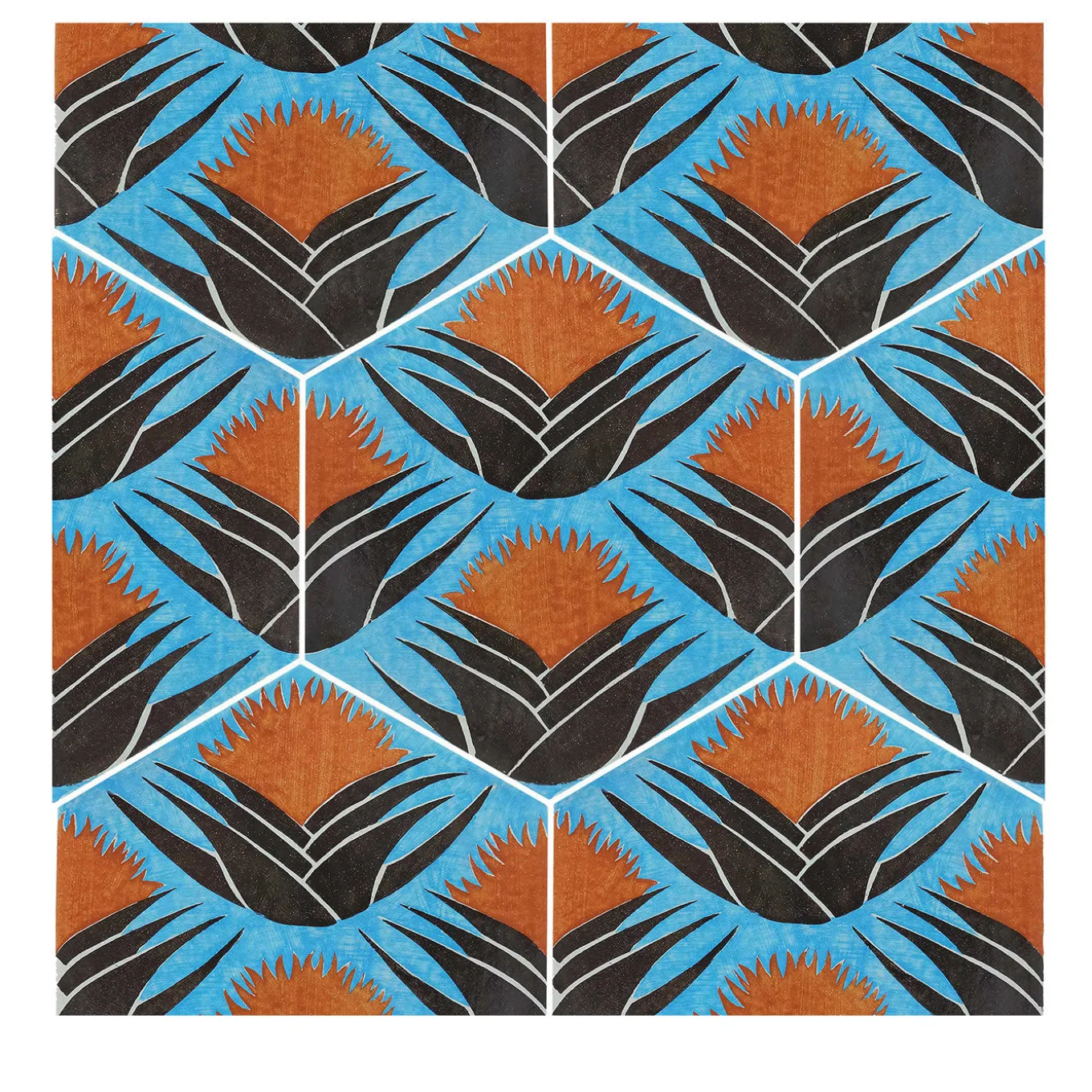 Part of a splendid collection inspired by the magnificent colors and wildlife inhabiting Sicily’s Etna volcano, this gorgeous set of four ceramic tiles by Vincenzo Messina will add a lively and stylish accent to a modern interior. Handcrafted following sustainable procedures, it is comprised of four hexagonal tiles decorated by hand in a light blue tone, enriched with wild cardoons combining orange and brown shades.