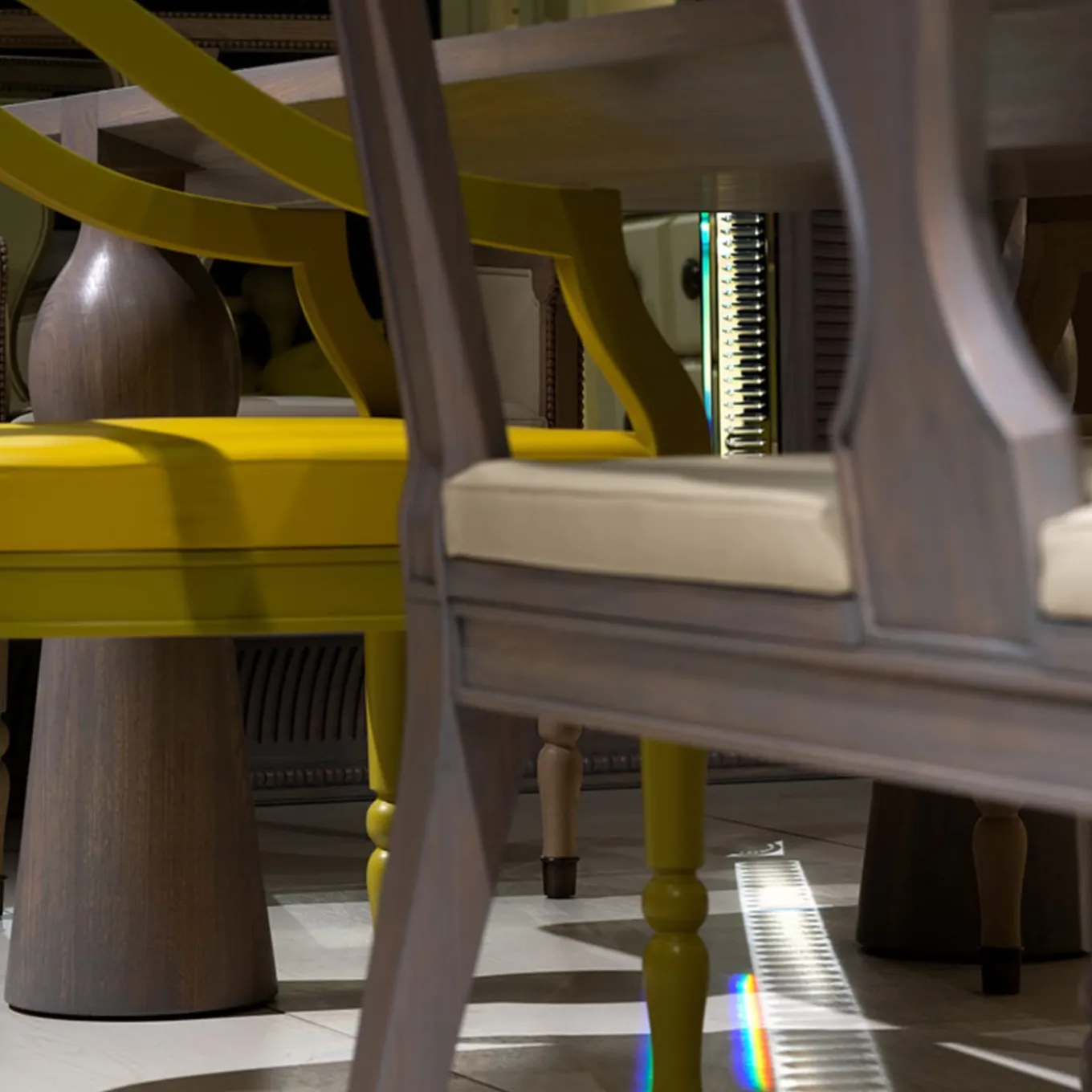 Following the Neoclassical style touching the whole collection by Archer Humphryes Architects is the Kings bench. Rigorous lines and small detailing define it: from the carved wood in the middle of the seatback to brass tips covering its front legs. The selection of a natural-oak finish and a leather upholstery enhances the bench’s shape, as well as highlighting the contrast between its classic side and the stylized touch of its designer.