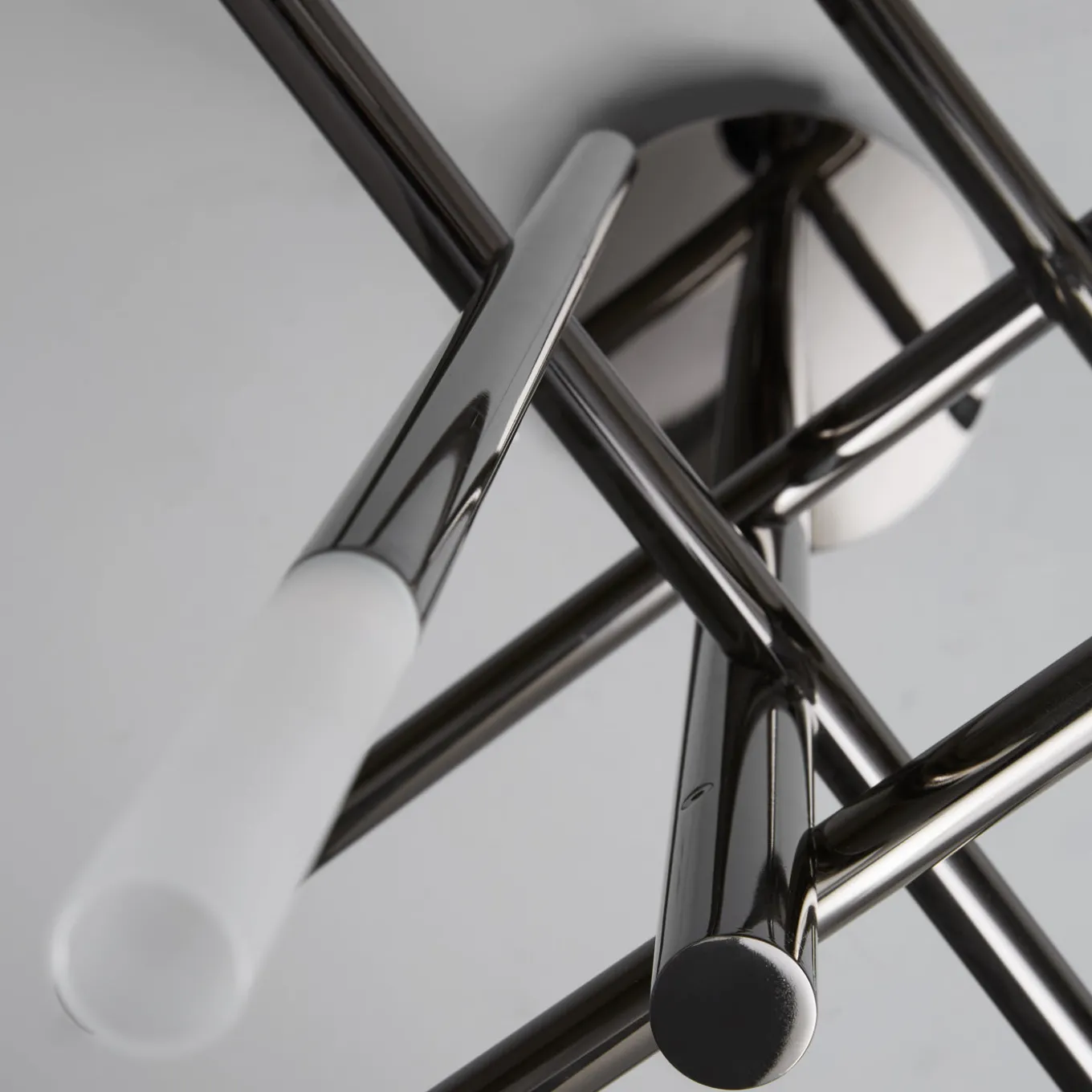 This elegant chandelier with a polished black nickel structure projects direct light from glazed glass diffusers at the top of metal rods assembled to form a system of parallel and perpendicular lines. The finish of the metal can also be in polished gold, matte black nickel or light burnished brass. Bulbs excluded. Contract and commercial certifications available upon request.