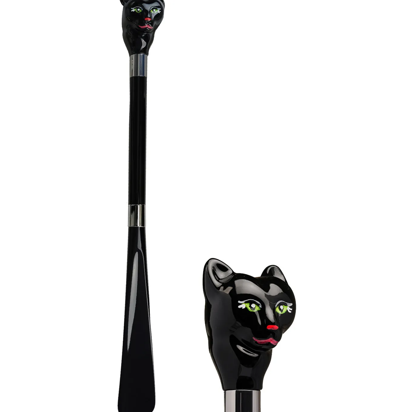 Luxurious and feminine, this shoehorn will be an ideal gift for cat lovers or aficionados. The marble powder handle decorated by hand is shaped like a female black kitten, its glossy surface perfectly harmonizing with the shaft lacquered in polished black and with the black ABS paddle. Silver-finished brass rings only interrupt the chromatic scheme. The piece comes with a branded case and with an integrated loop for easy hanging.