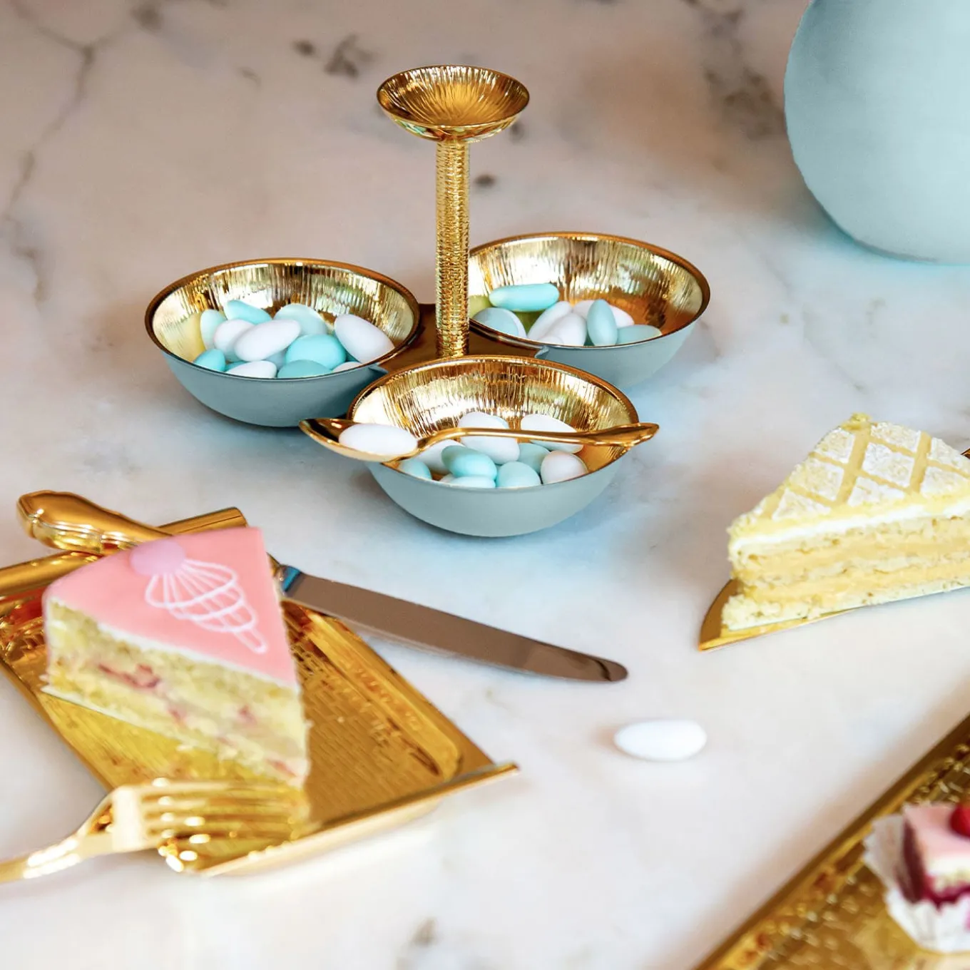 Serving appetizers, chips, or sauces on refined tables requires a likewise precious design like this hors d’oeuvre plate. A texture reminiscent of sunbeams enlivens the gold plating, a choice that emphasizes its reflective surface. A small bowl tops the streamlined grip, while larger bowls define the plate’s silhouette, externally showcasing a bright and glossy smooth finish.