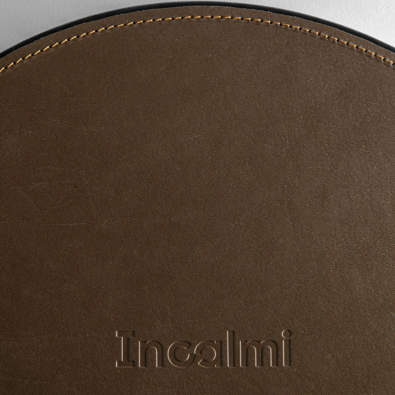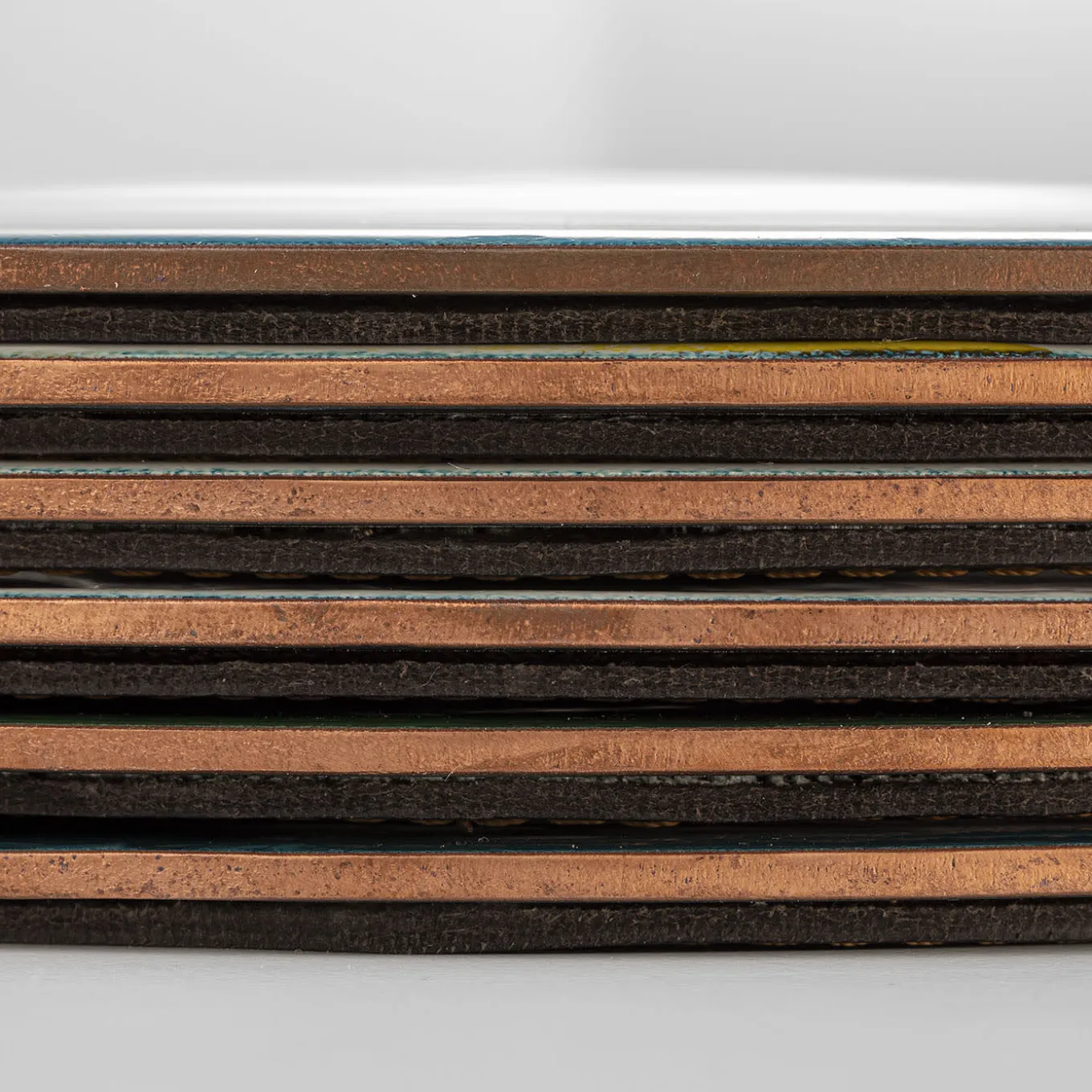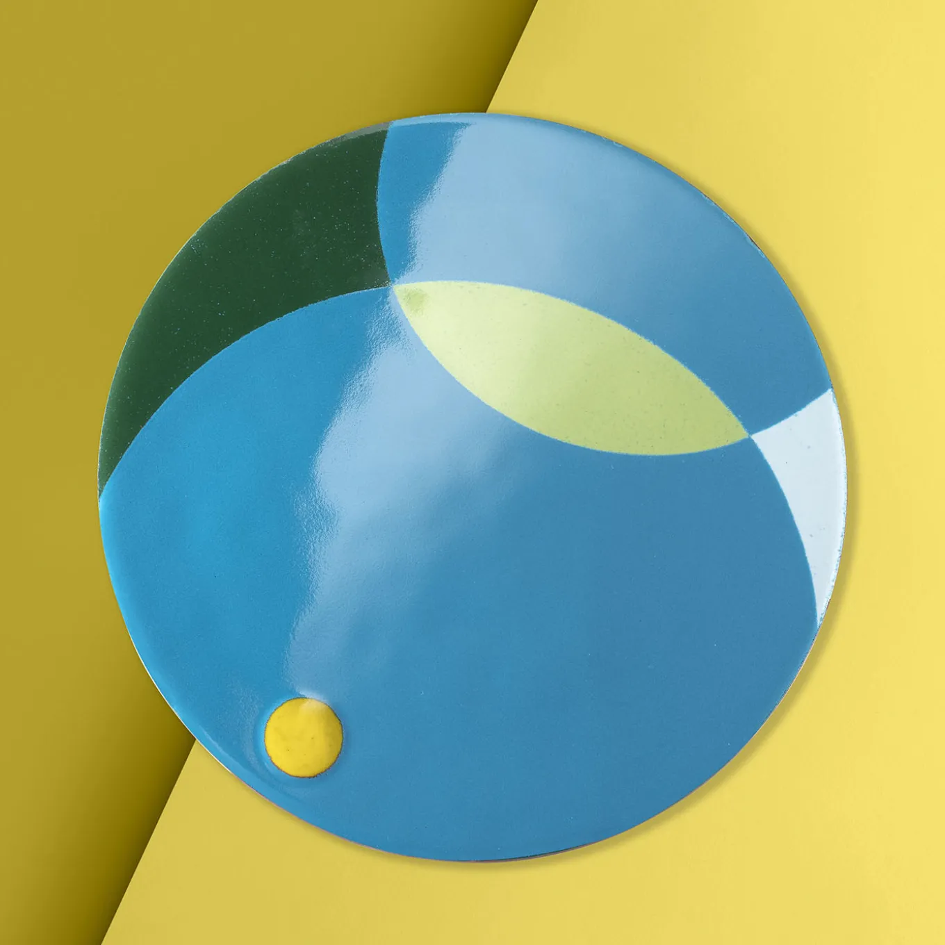 Collection of decorative plates made using the technique of fire enamel on copper. The colors and motifs come from a visit to the Guggenheim Museum in New York, while the technique is a tribute to Italian design from the 1950s, 1960s, and 1970s. The back is enameled and covered in hand-stitched dark brown leather.