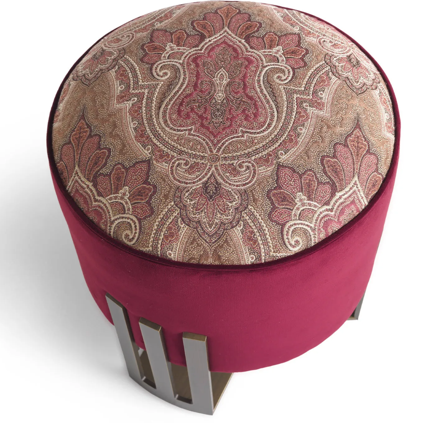 Versatile and compact, the Klee pouf is a superb mix of elements in a perfect Etro Home Interiors style. The upholstery in typical fabrics of the collection, with Paisley motif or Suzani pattern, combined with the refinement of the metal structure with the shape inspired by Etro’s logo contributes to express the multifaceted spirit of the brand. Structure in patinated bronze metal. Seat in wood and foam. Upholstery in fabric cat. A Deosai col. 1 Paradox and velvet cat. A Firenze col. 1 Raisin with piping in velvet cat. A Firenze col. 1 Raisin. Contact the Concierge for customization options.