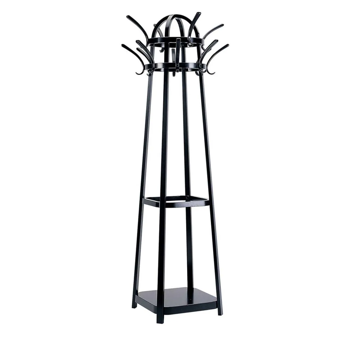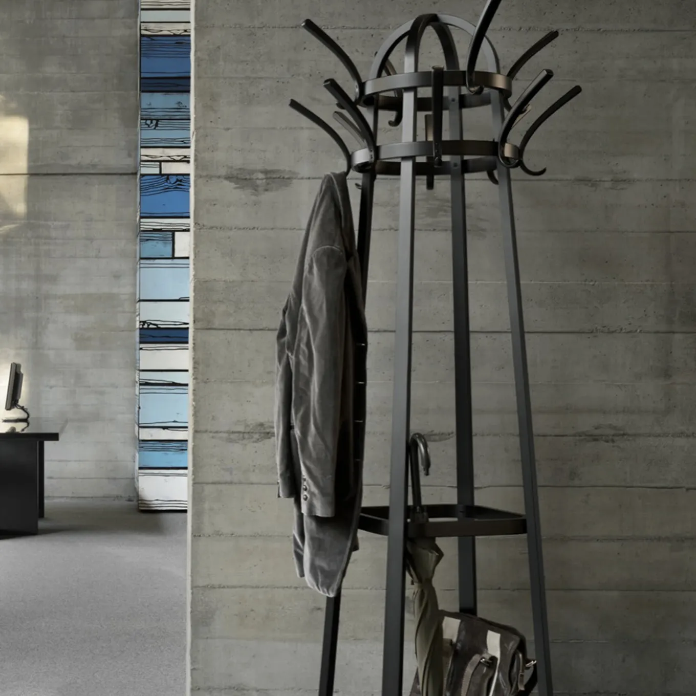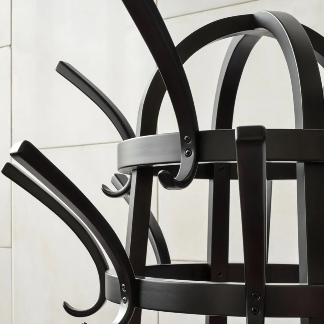 This magnificent piece of functional decor will enliven any interior as a multi-functional coat rack stand in an entryway or public space, while offering at the same time a structural decorative accent. A piece of historical design, this object was created in 1905 by Koloman Moser, a Viennese artist and designer whose timeless creation is current after more than one hundred years. The piece has a striking black lacquered finish.