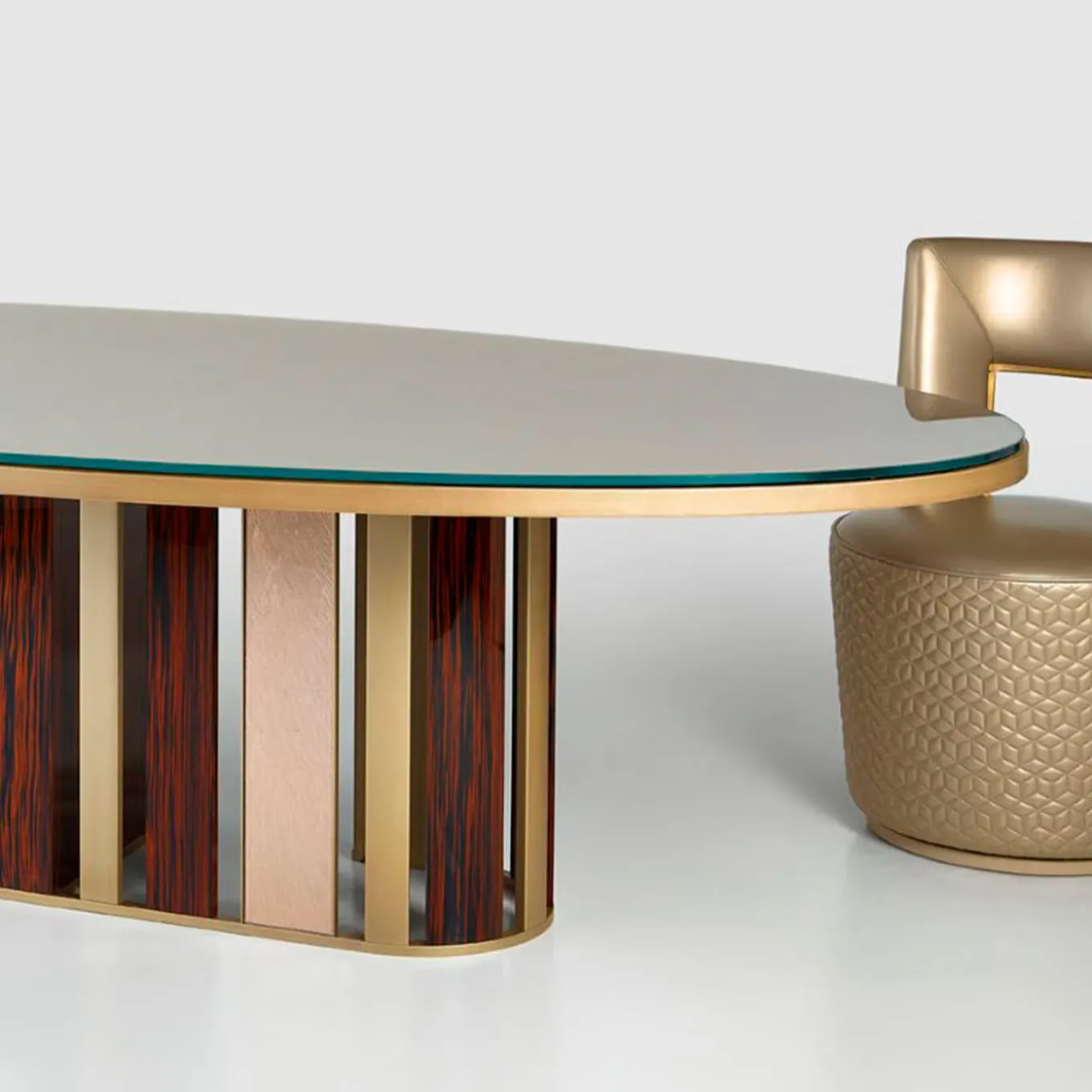 Structure in metal. Frame in rigid slats, in ebony and metal, in a circular motion to support the oval glass top; a pure and versatile material. A table with a fresh and modern style.
