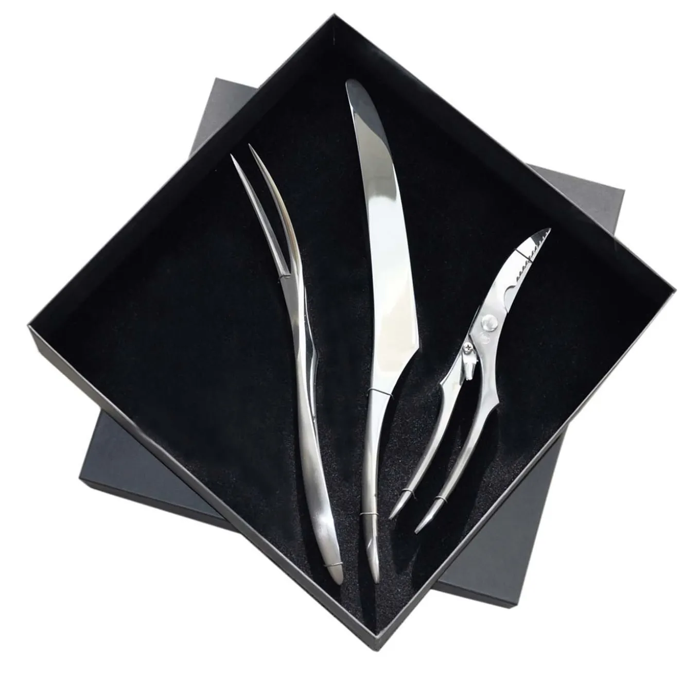 A sleek addition to a contemporary table, the Kosmo 3-Piece Roast Serving Set is characterized by soft, gentle lines. The stainless steel roast serving set includes a two-pronged fork, a carving knife and a pair of poultry shears, each with a mirror-like finish. The set comes with a gift box and care instructions, making it an easy housewarming gift.