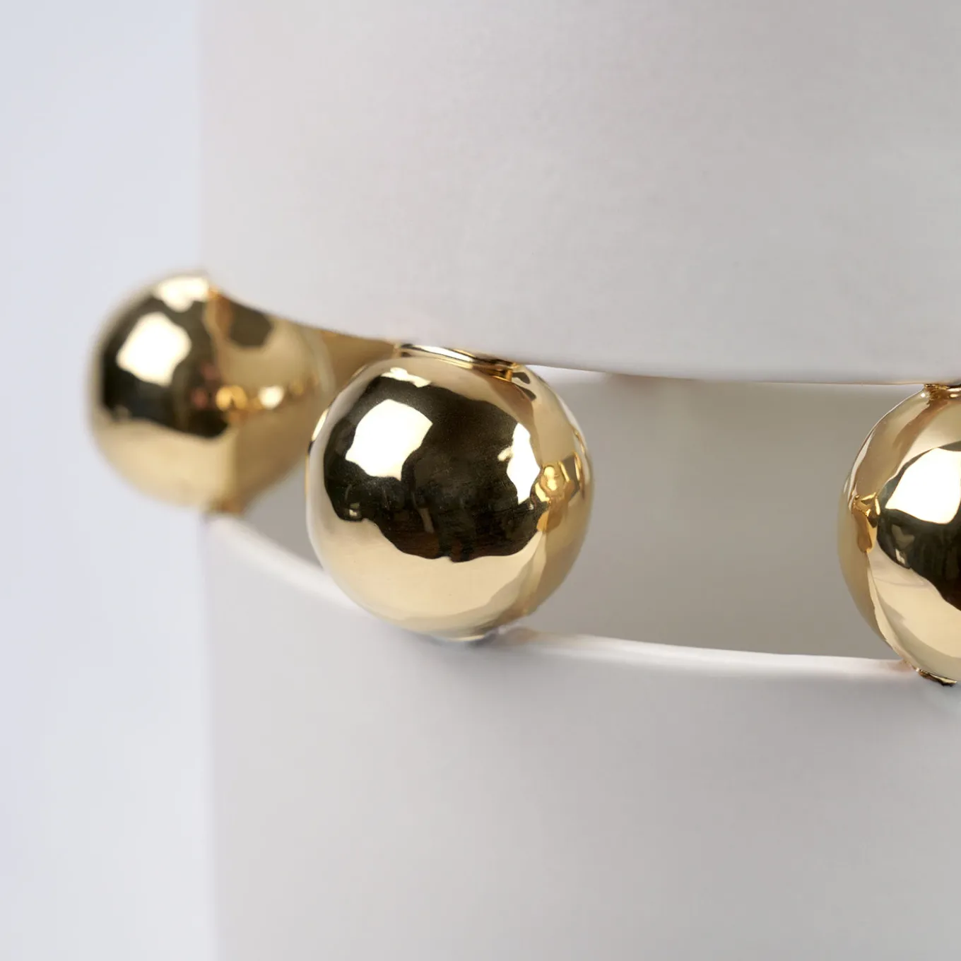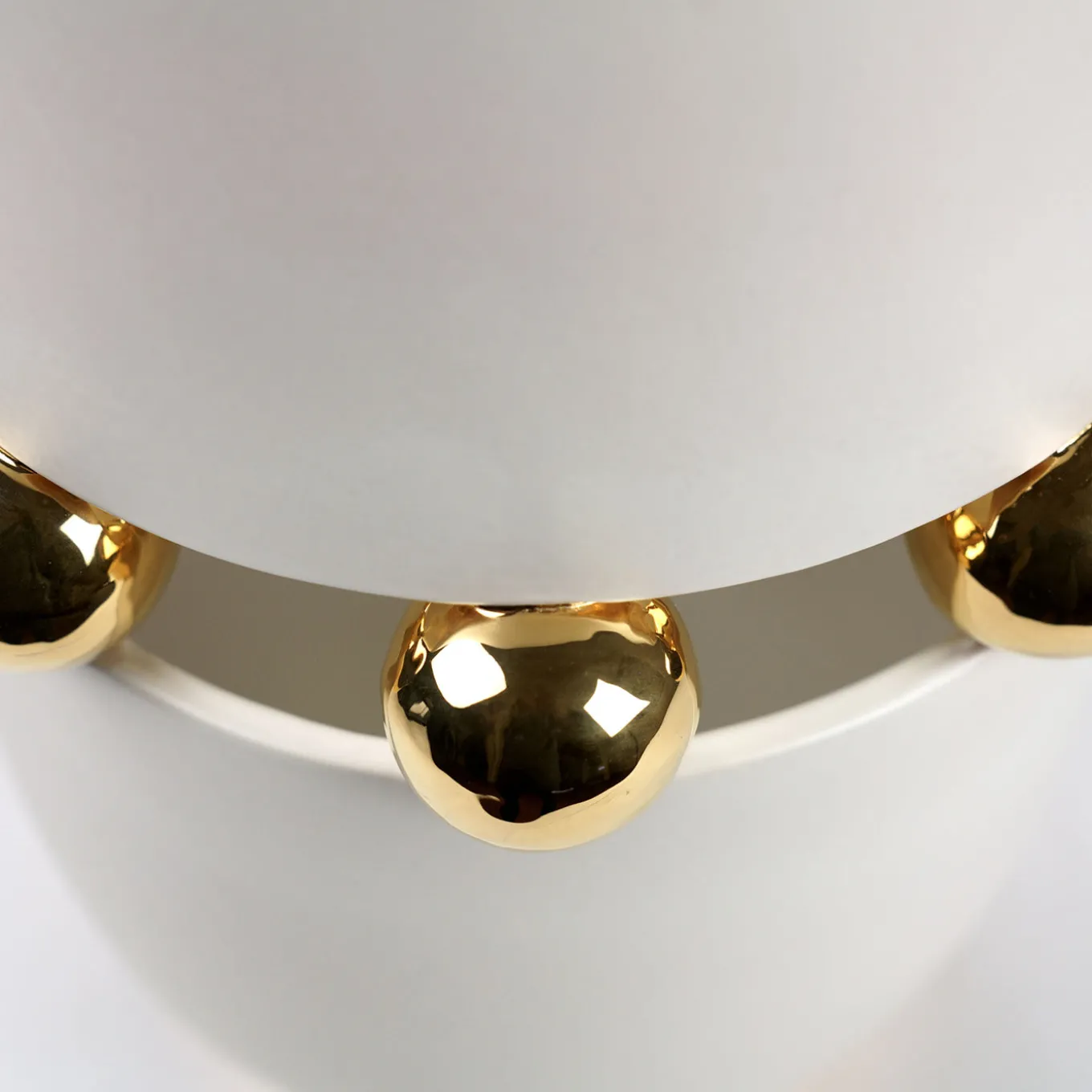 The Kósmos vase features a matte white finish contrasted by reflective elements accented with 24kt gold luster. Its design highlights a ring of golden spheres around the middle, creating a striking visual balance between simplicity and intricate ceramic artistry. Each vase undergoes a complex three-stage firing process, culminating in the final third firing that enhances the gold’s radiant shine. Slight variations may occur, reflecting the artisanal craftsmanship behind each piece. Customizable color.
