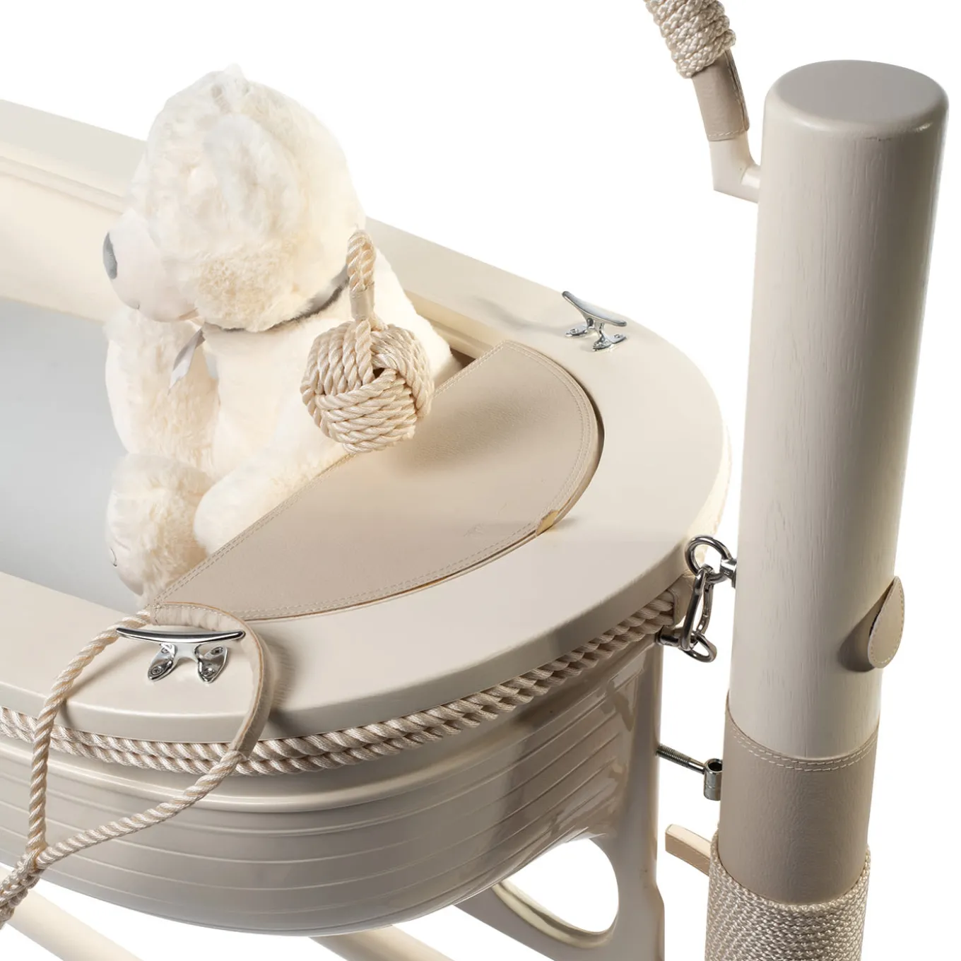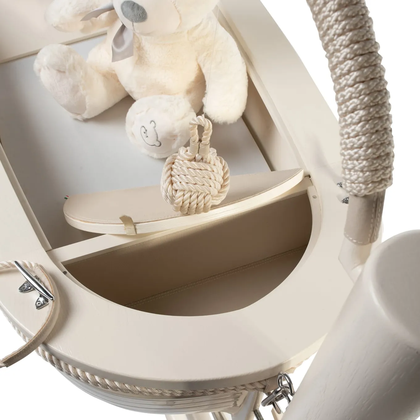 A cozy nest-like surrounding for newborns, this boat-shaped cradle allows parents to gently rock their babies to sleep seemingly on the water’s surface. Enriched with coherent nautical rope accents, the cradle boasts a sturdy white-lacquered wooden structure with faux leather, fiberglass, and steel inserts. A top – included with the delivery – can be interchanged for transforming the design into a writing desk.