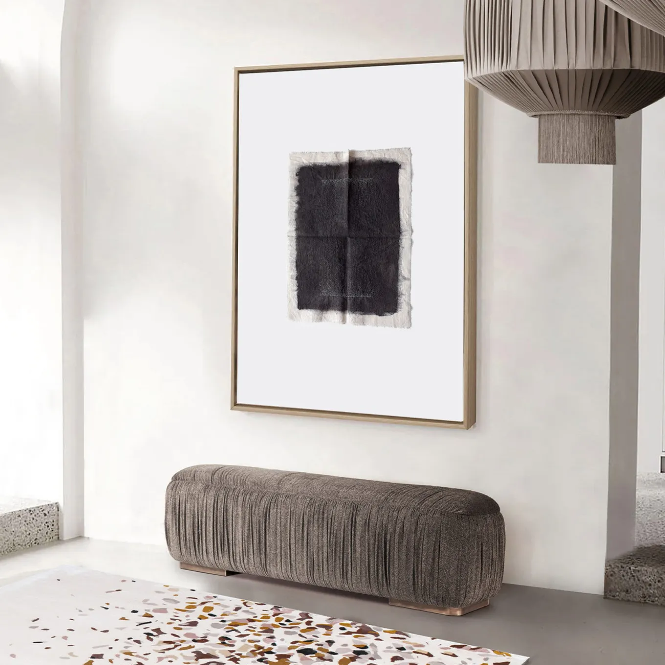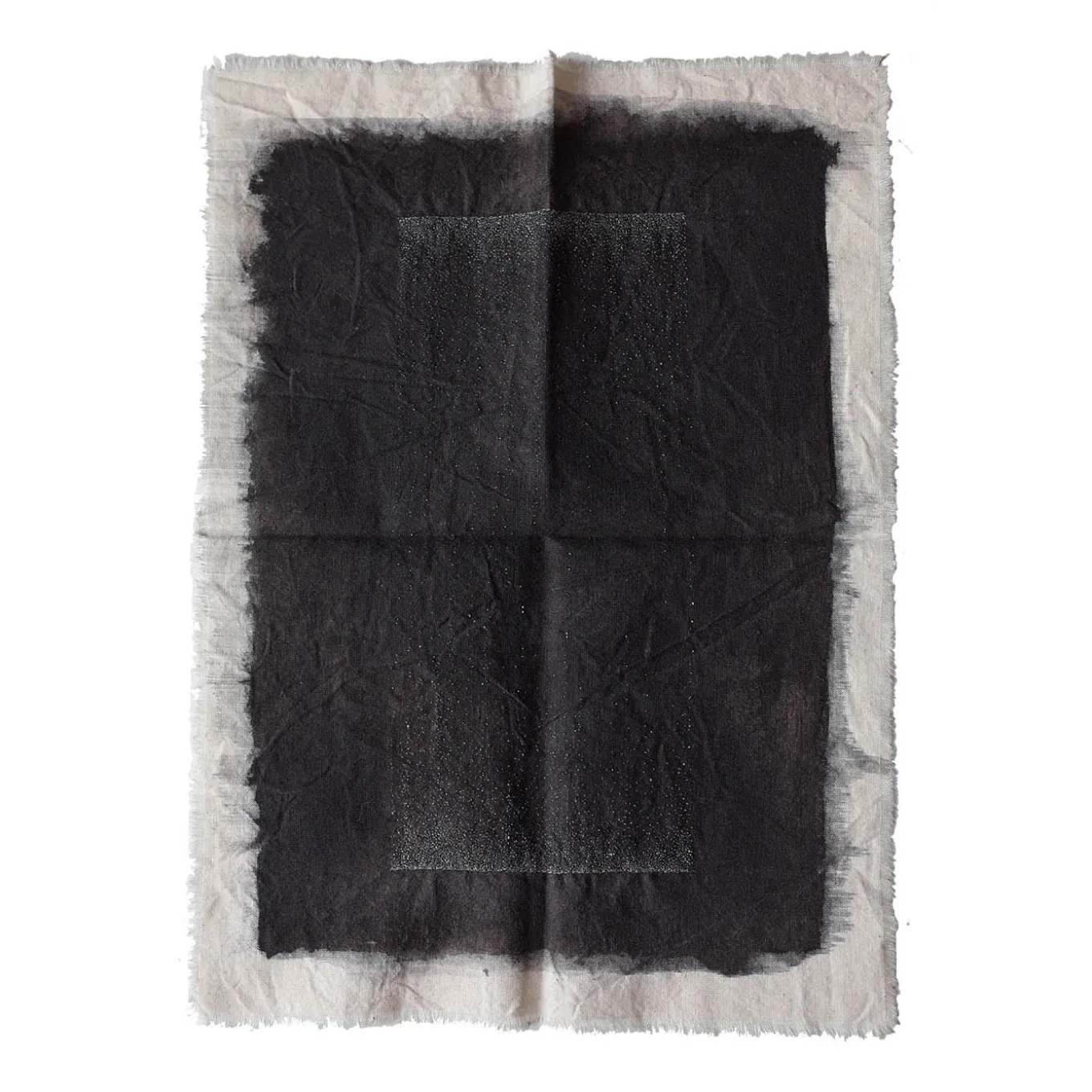 A masterful, well-balanced combination of ink, water, and embroideries – where the single stitch is intended as a base unit – describes the essence and work behind this stunning singular painting on cotton canvas. Conceived as a sort of talisman that enables greater visions, it flaunts a double-sided design that underlines the unifying role of the needle. The frame is not included.