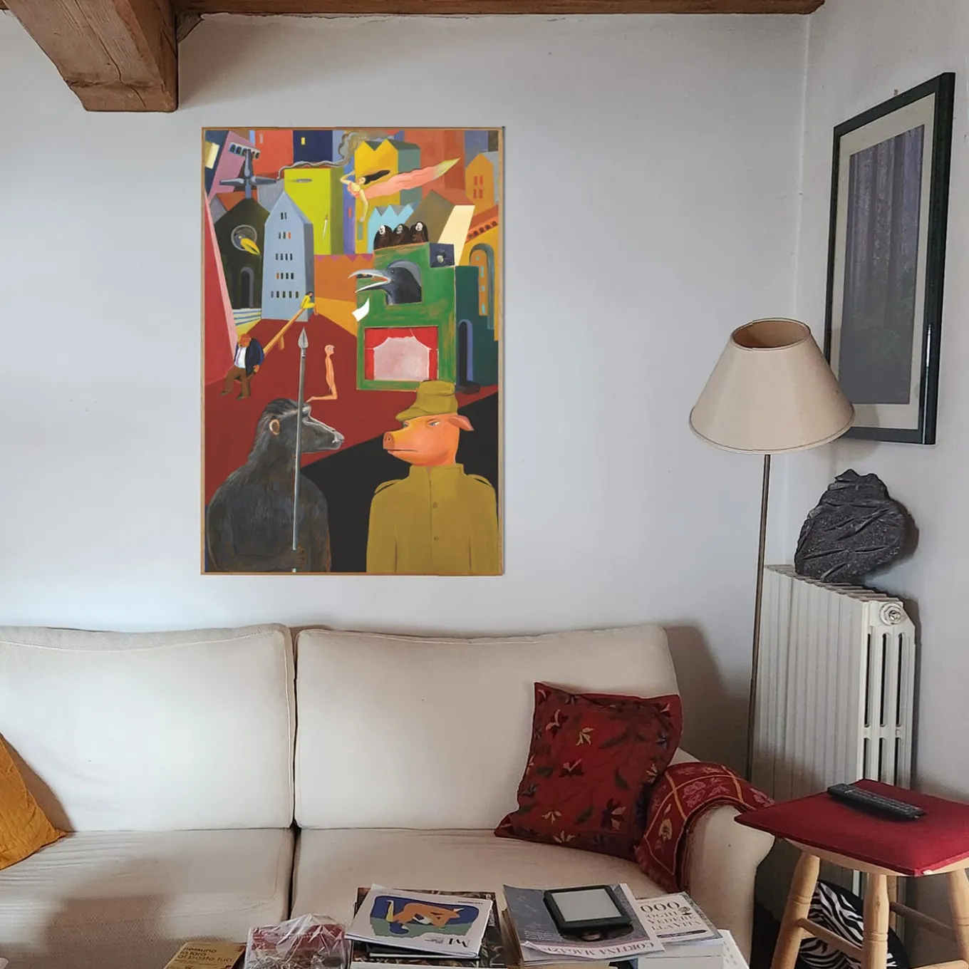 This exquisite painting part of the Tarocchi series offers a surreal version of a trial. A man is in anguish waiting for his verdict since, due to unfocused judges, justice is taking too long to complete its path. Unconventional, rude soldiers safeguard the proceeding, the whole scene painted in vibrant colors for an ironic counterbalance to the moment’s emotional heaviness. Frame not included.