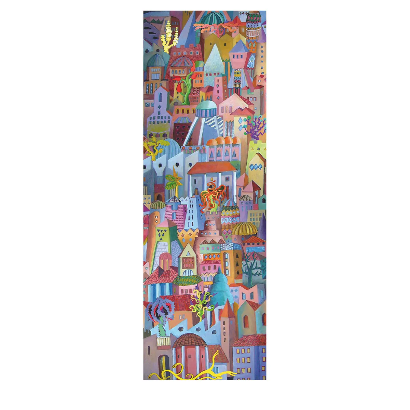 Fantasy and color define the lively personality of this tapestry, authentic artwork inspired by the settings Italian writer Italo Calvino described in his books. Fantastic trees peek out from a colorful urban landscape, where the rich assortment of its architecture mirrors a likewise abundance of vivid colors. A playful vision of a big city, seen through an innocent childlike lens. The piece will be ideally fitted to ceilings, more functional to let its light filtering quality emerge.