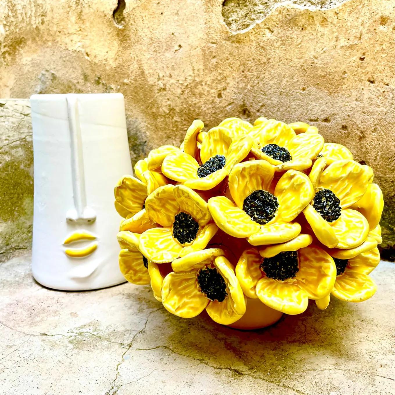An authentic work of art sporting playful anthropomorphic traits, this ceramic design is a romantic synthesis of decorative and storage potential. Equipped with an inner unit to easily collect items, it boasts a bouquet of blossoming yellow daisies as a lid making it an ideal addition for contemporary tables. Please explore the Artemest catalog for different variants.