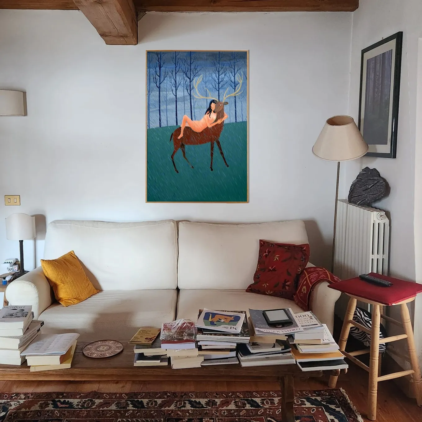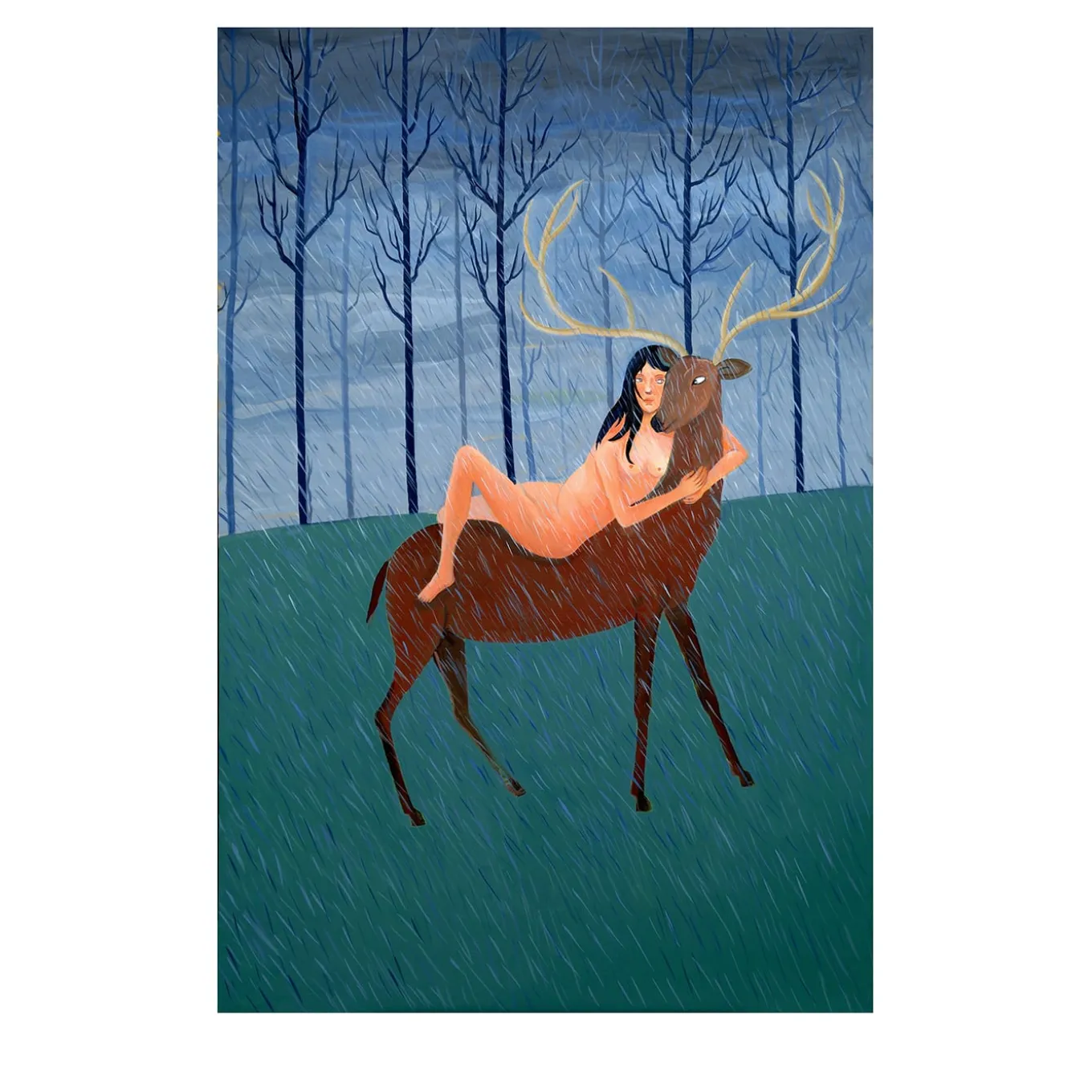 Part of the Arcani Maggiori cycle, this sophisticated painting hides a special allegorical value. A nude woman lays on the saddle of a deer, their secret alliance purified by the rain falling heavily on them and that also hints at a prophetical function. A forest of bare trees completes the painting’s melancholic scenario. Frame not included.