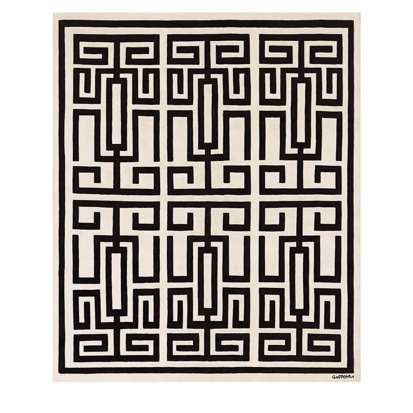 Striking visual depth and three-dimensionality distinguish this exclusive geometric-style rug, woven in Nepal from mostly fine wool yarns. Neatly emerging from its white backdrop, the intriguing labyrinth-like motif by Gio Ponti is fully revealed in its hypnotizing quality when unfurled on the floors of wide contemporary-style interiors. Different color options are also available.
